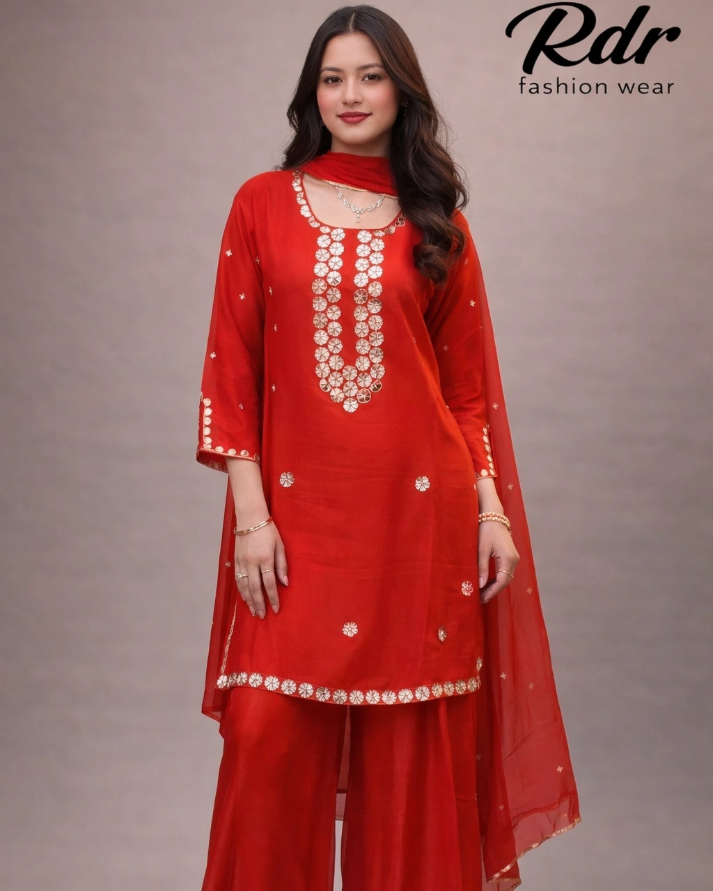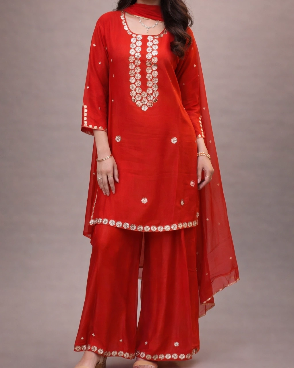 Product Name: Elegant Red Embroidered Kurta Palazzo Set with Dupatta