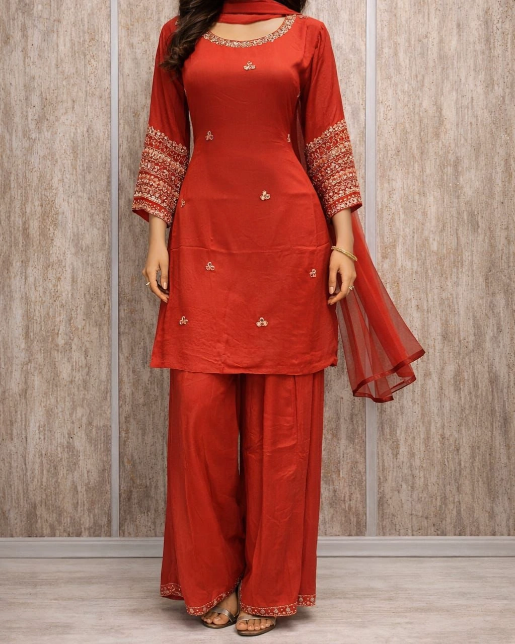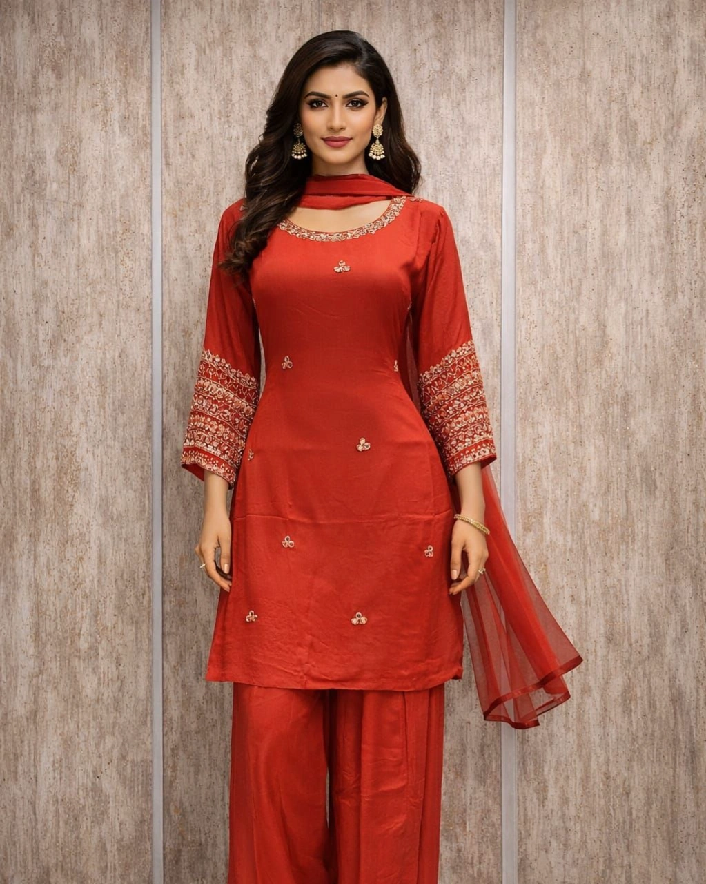 Product Name: Elegant Red Embroidered Palazzo Suit Set