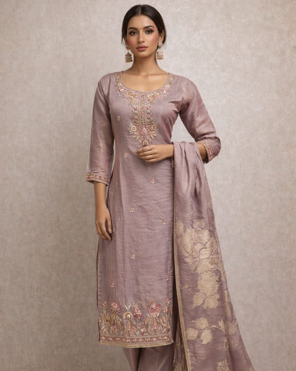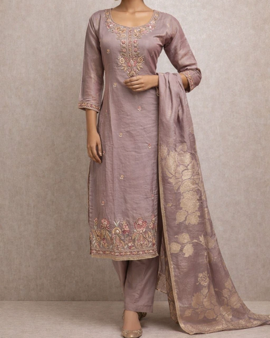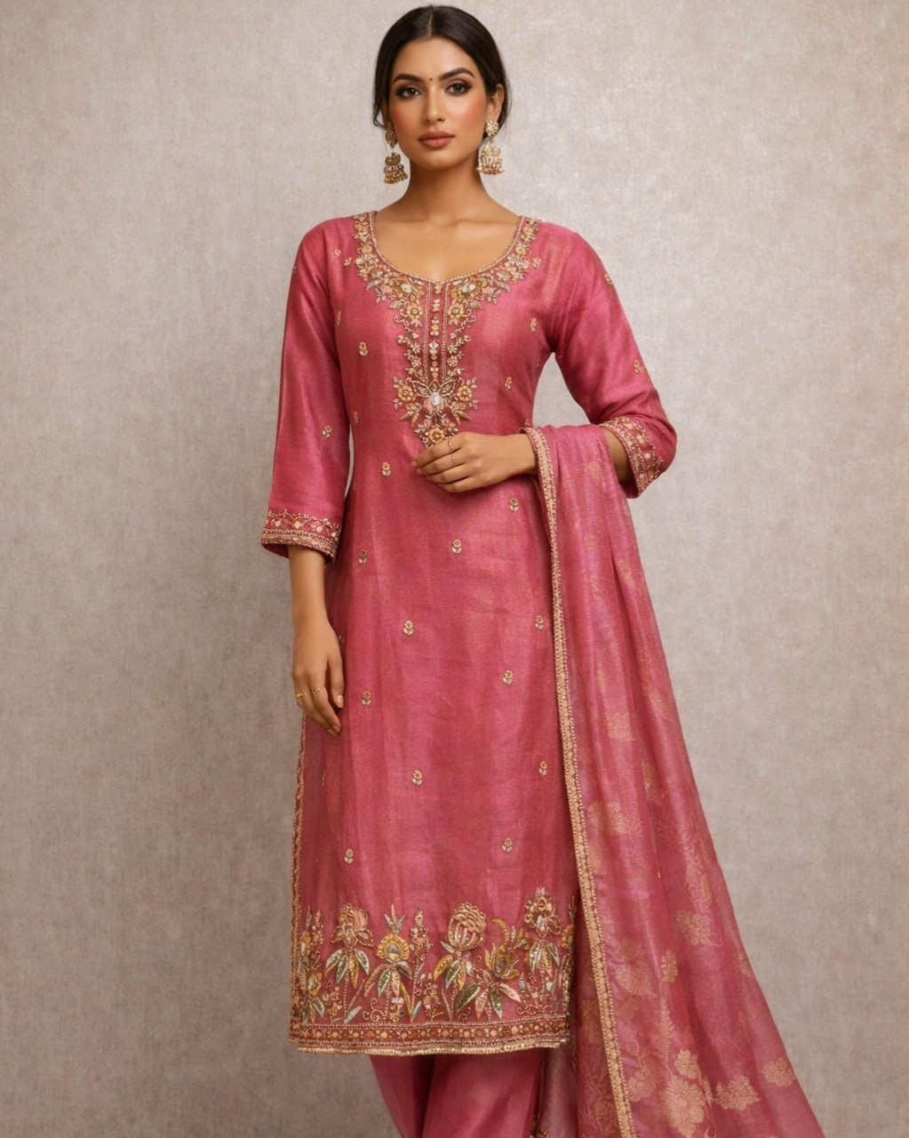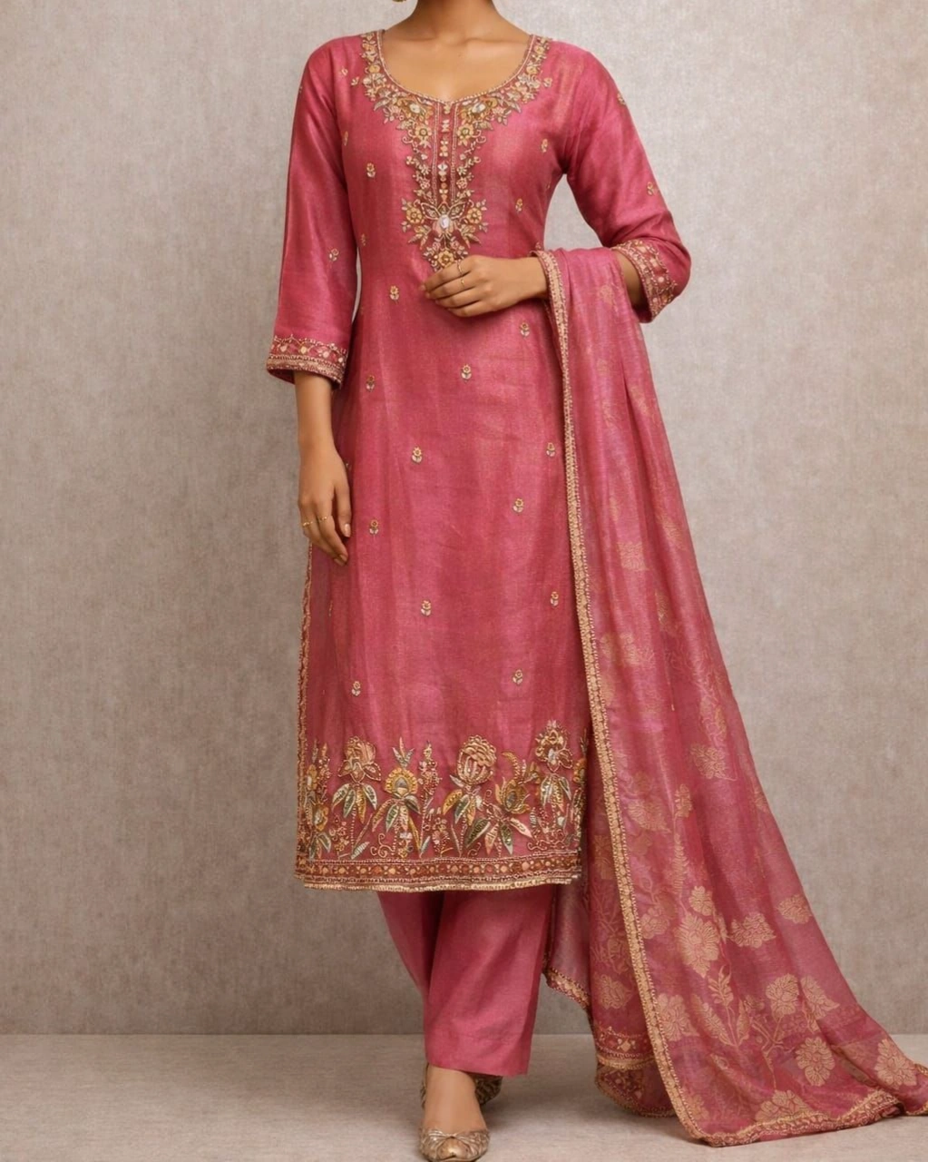 This graceful rose pink kurta set showcases exquisite floral embroidery on the neckline and hemline, giving it a rich and elegant appearance. The matching pant complements the kurta beautifully, while the lightweight designer dupatta with golden woven patterns adds a touch of sophistication. A perfect outfit for women who love stylish yet traditional fashion.