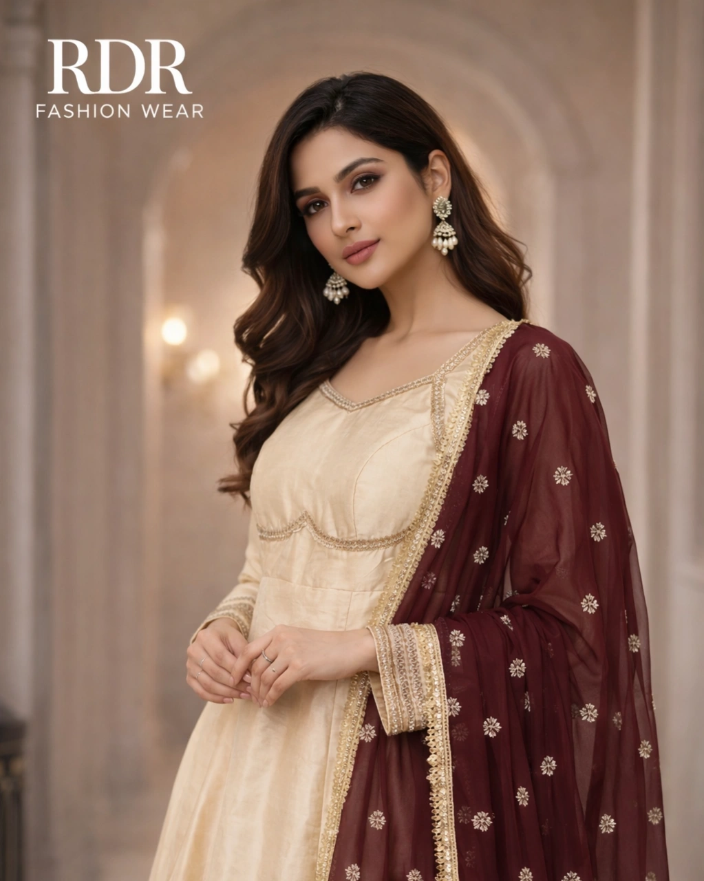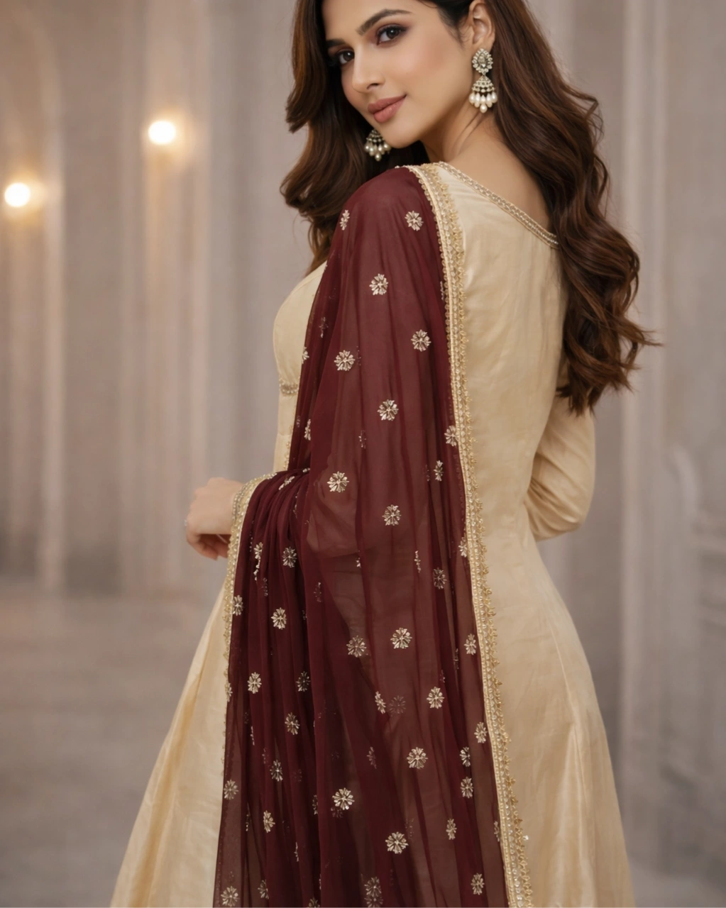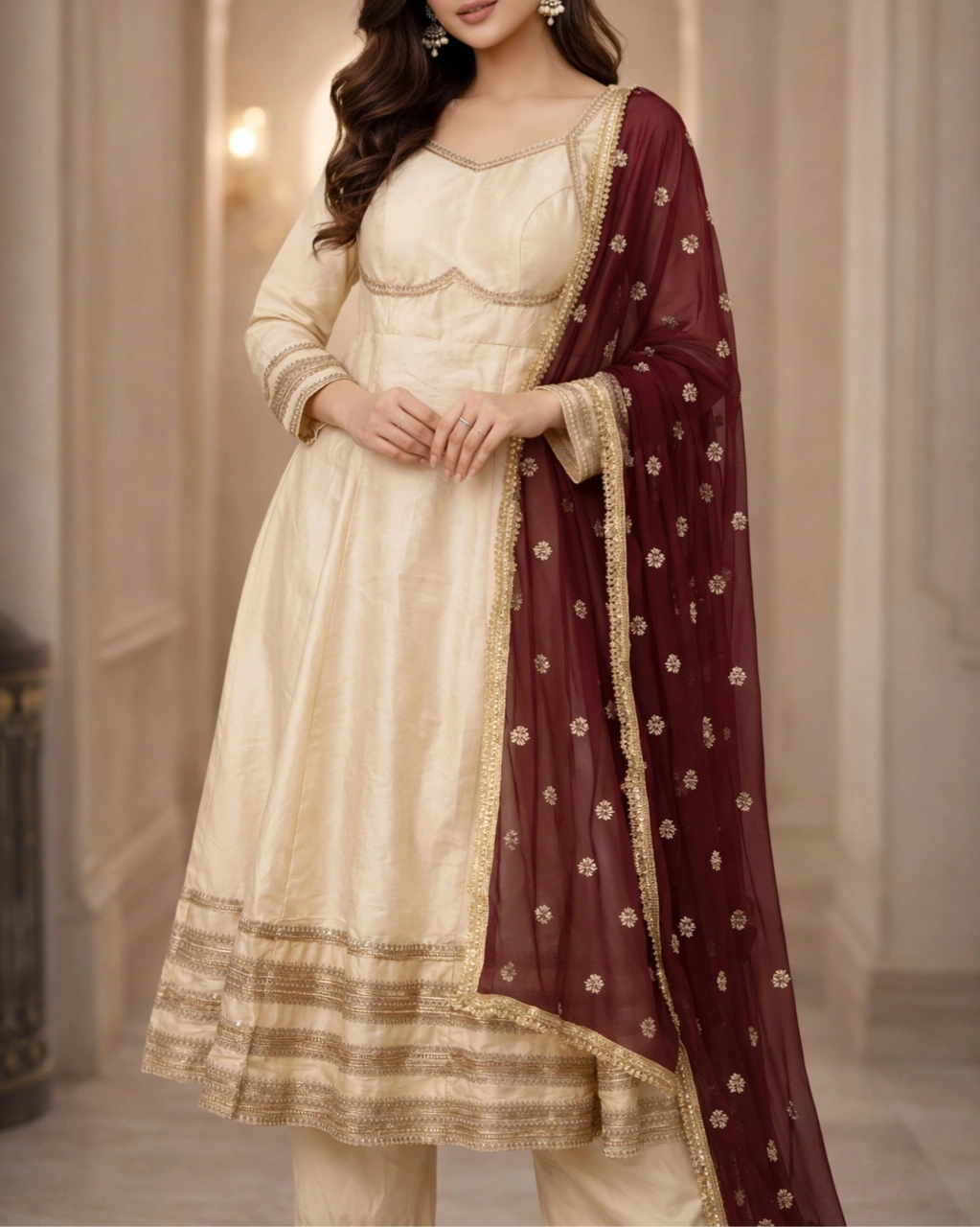 Product Name: Royal Cream & Maroon Festive Anarkali Set