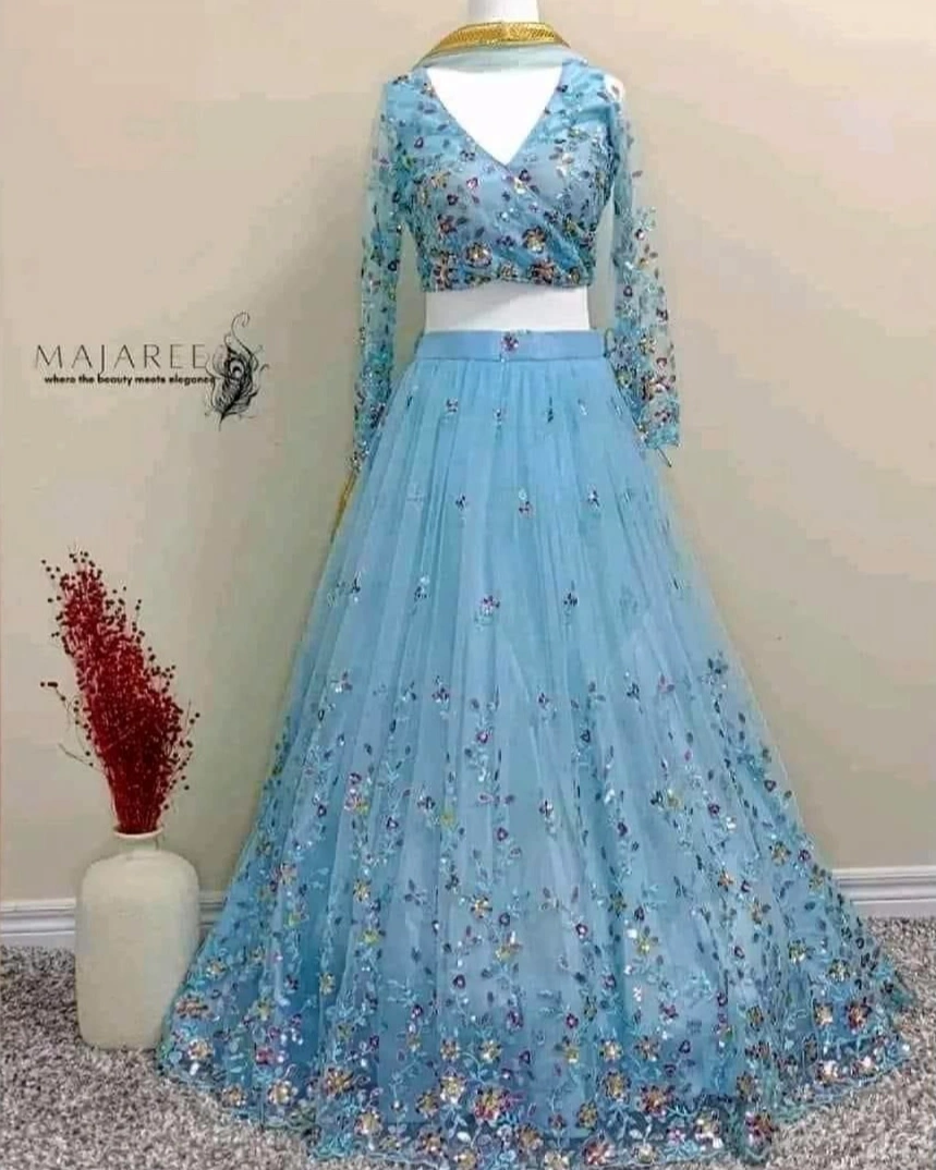 Sky Blue Floral Embroidered Semi-Stitched Lehenga Set