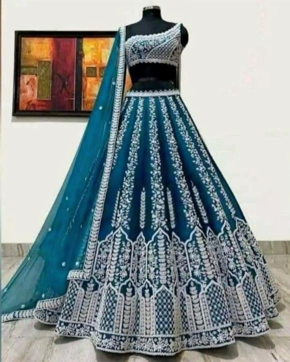 Teal Blue Heavy White Embroidered Semi-Stitched Lehenga Set