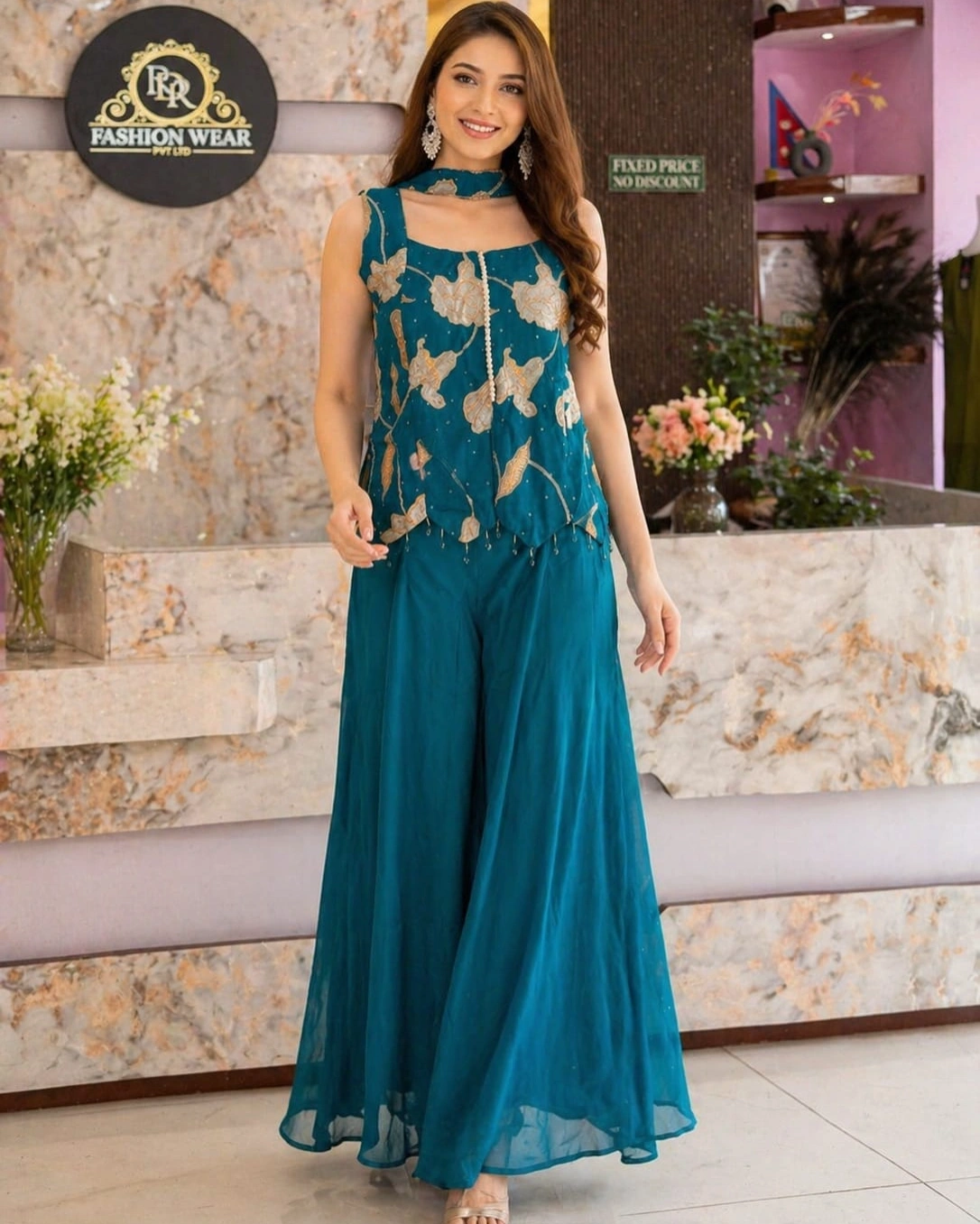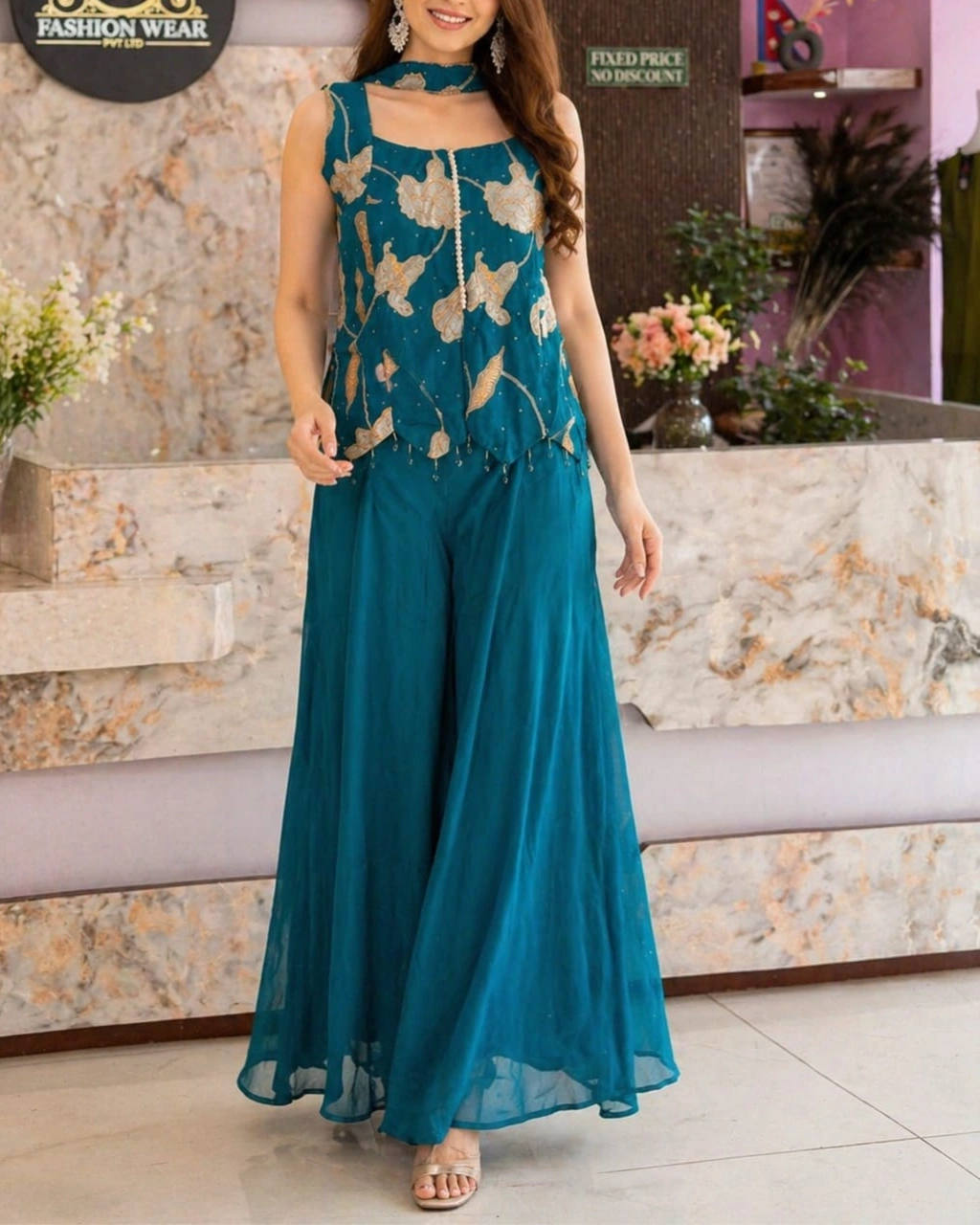 Turn heads with this stunning teal co-ord set, designed for modern elegance with a festive touch. The sleeveless kurta-style top features intricate floral embroidery with delicate embellishments, paired with flowy palazzo pants that create a graceful silhouette. Finished with a lightweight dupatta, this outfit is perfect for parties, festive events, and special occasions.
