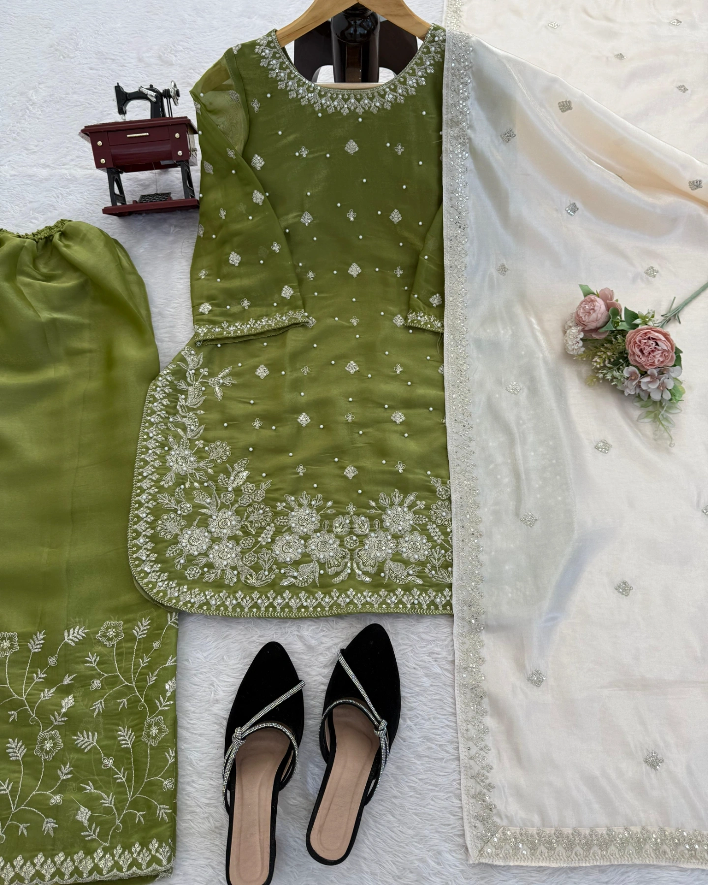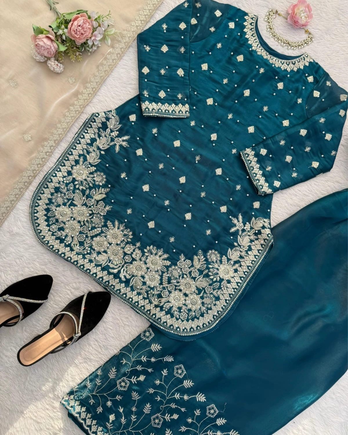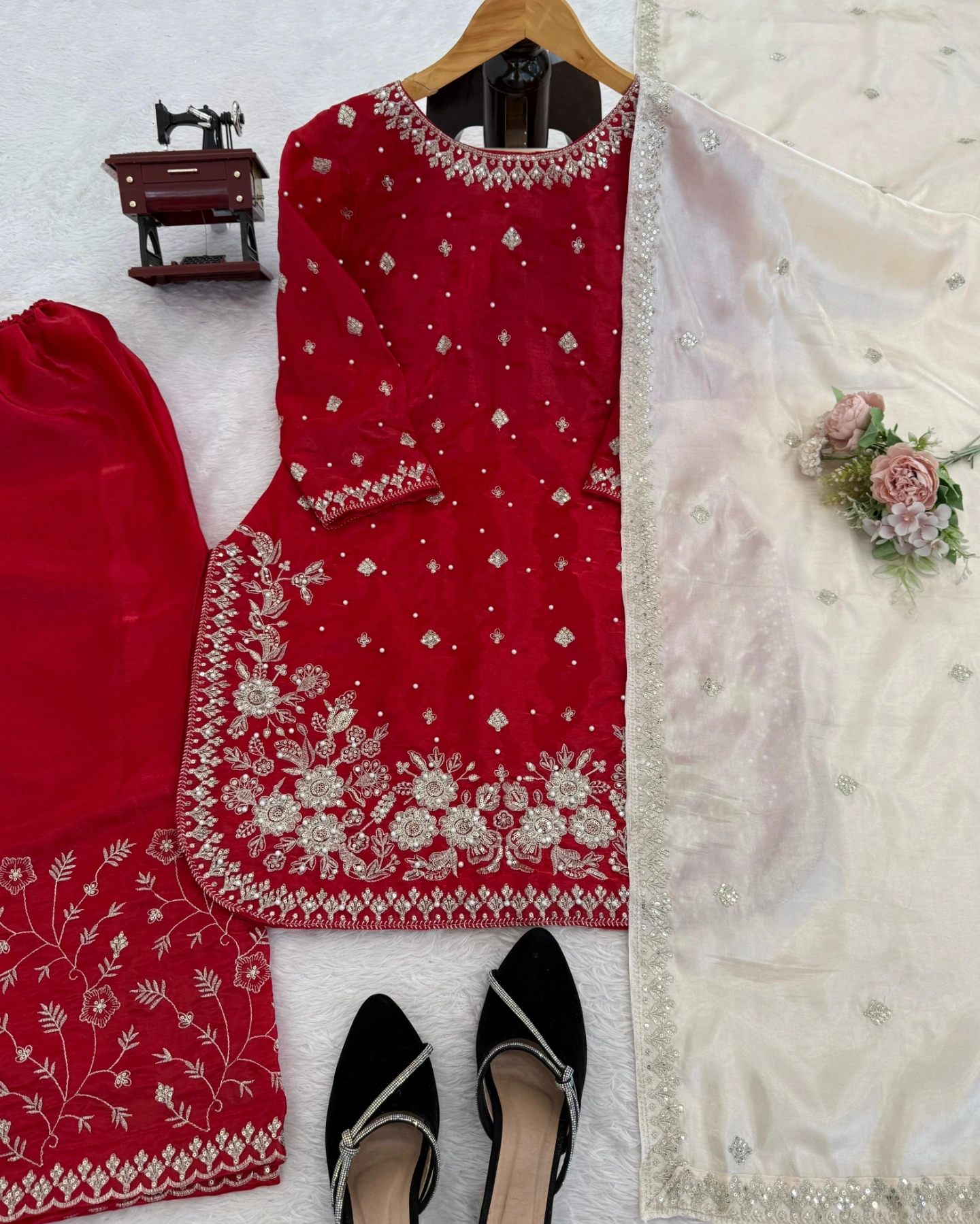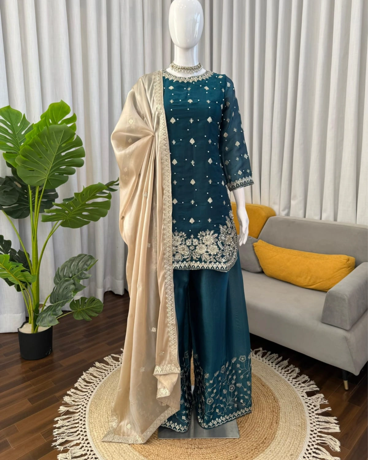 Fabric: Premium Organza (Kurta & Sharara) with Inner Lining, Silk-Blend Dupatta