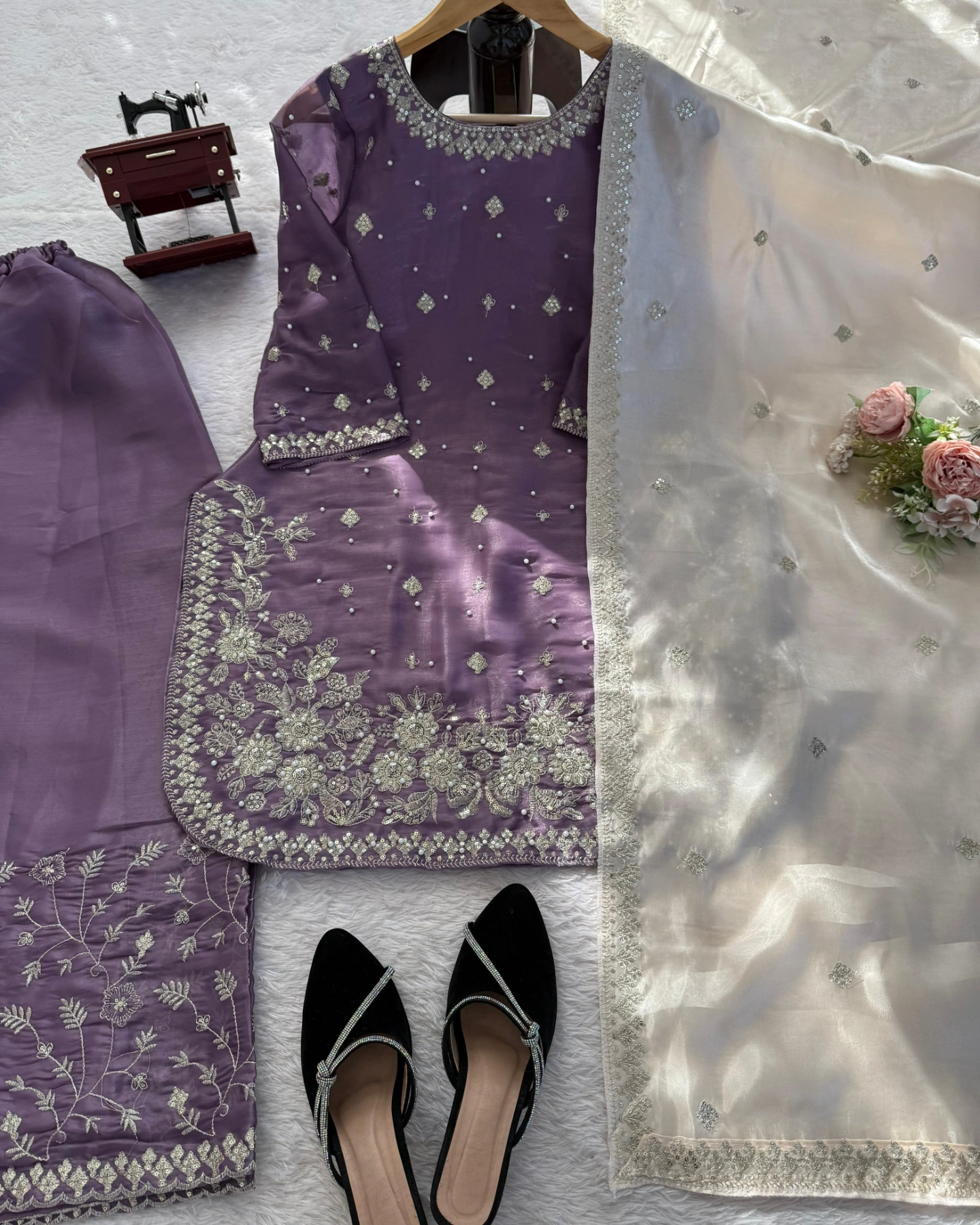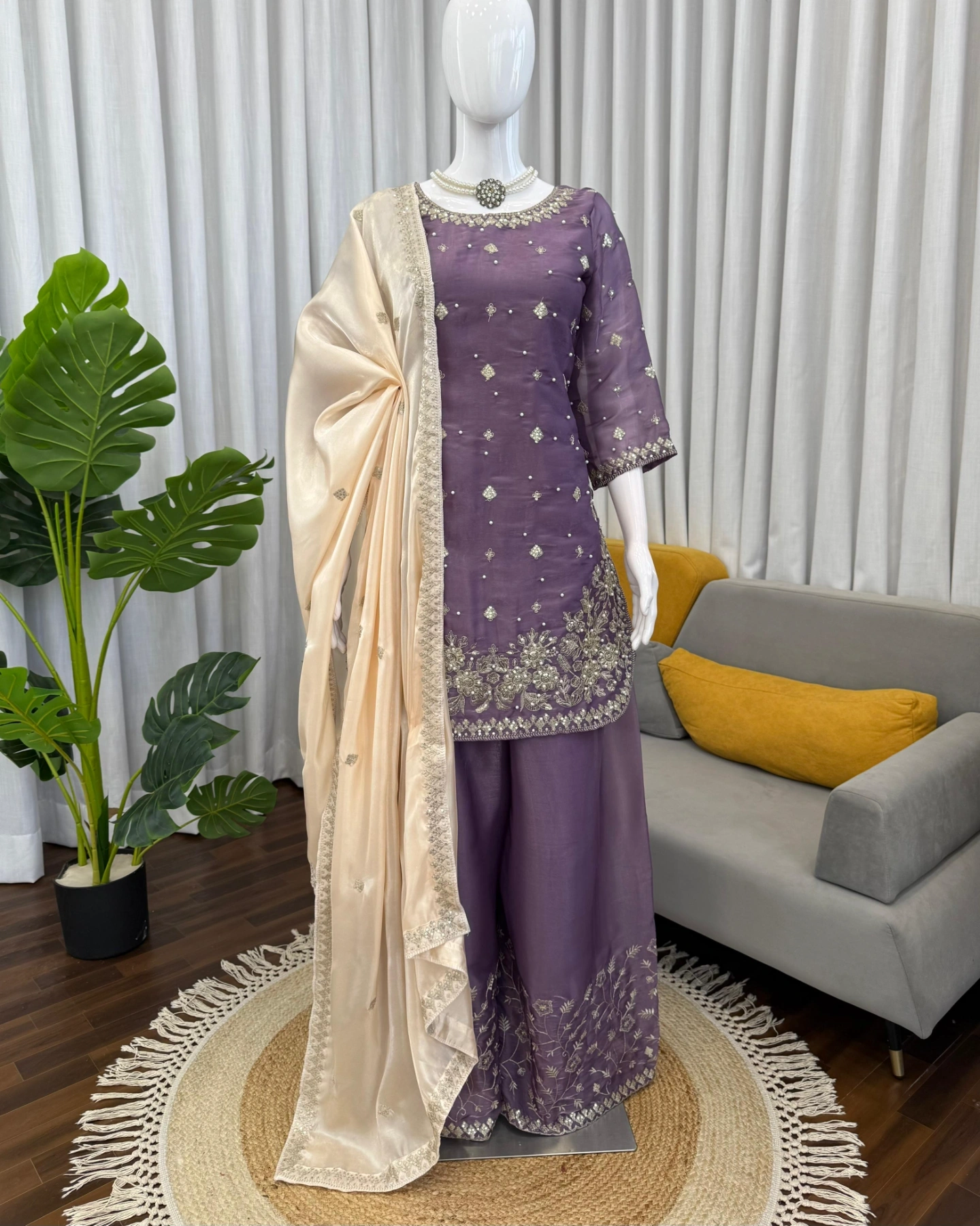 This is a beautiful, elegant Lavender Organza Kurta set with matching Sharara. It has a very sophisticated, high-end feel.