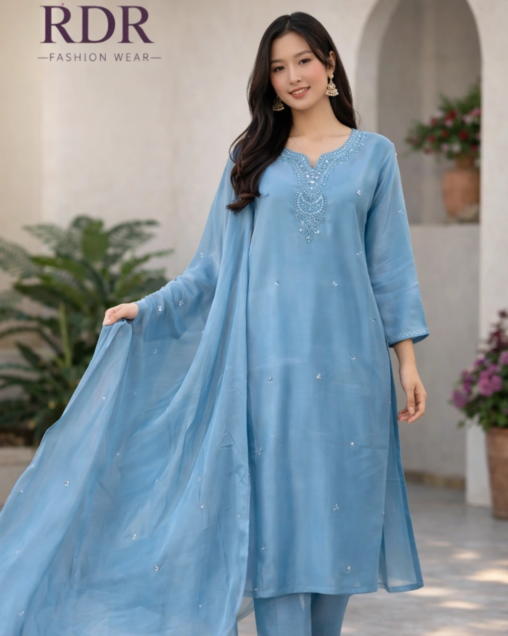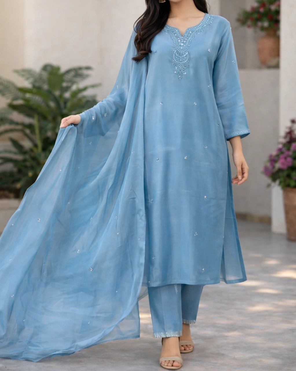 Work: Beautiful delicate thread embroidery with subtle sequin detailing on the neckline and scattered motifs across the kurta, paired with a lightweight sheer dupatta featuring elegant embellished accents and soft border finishing.