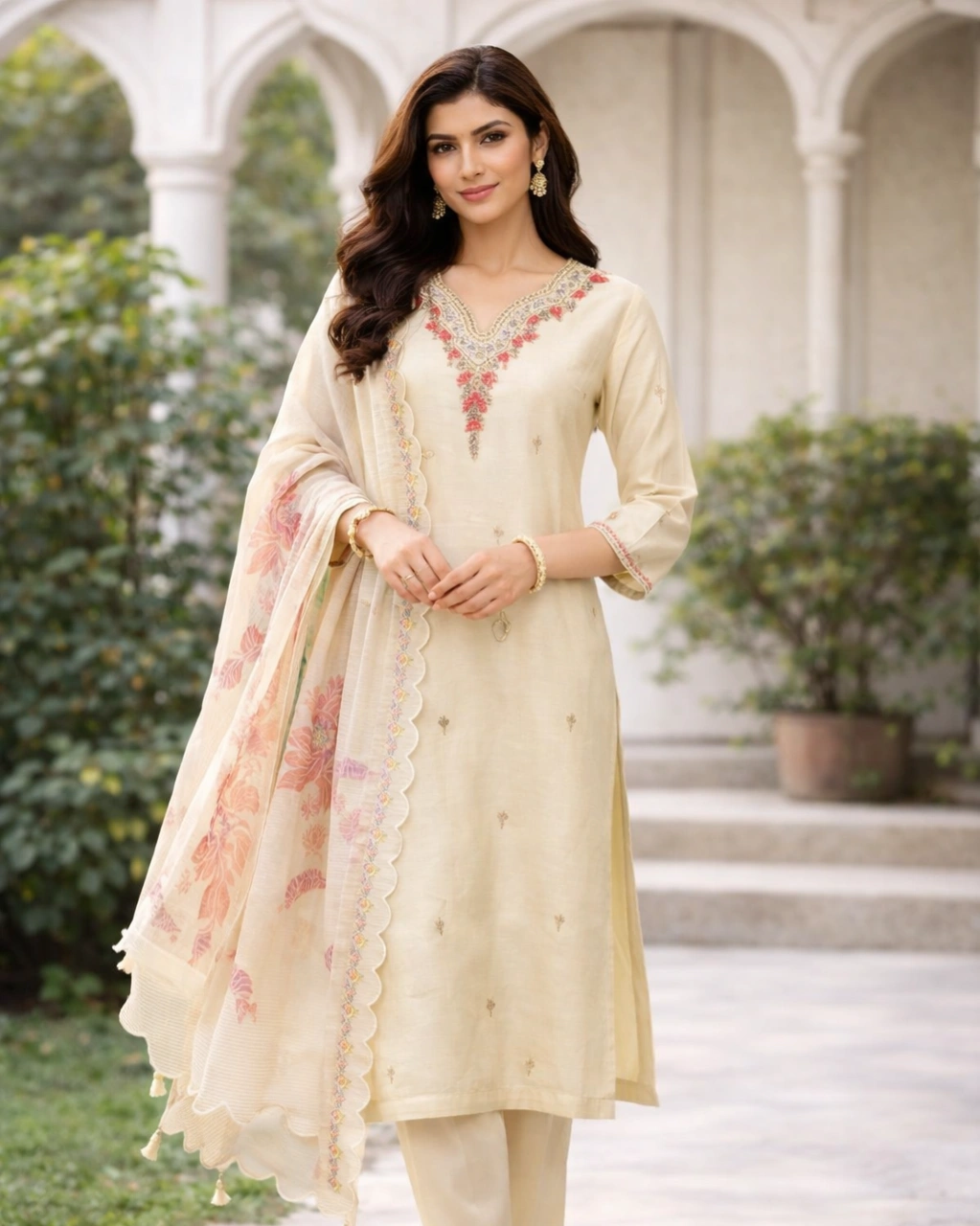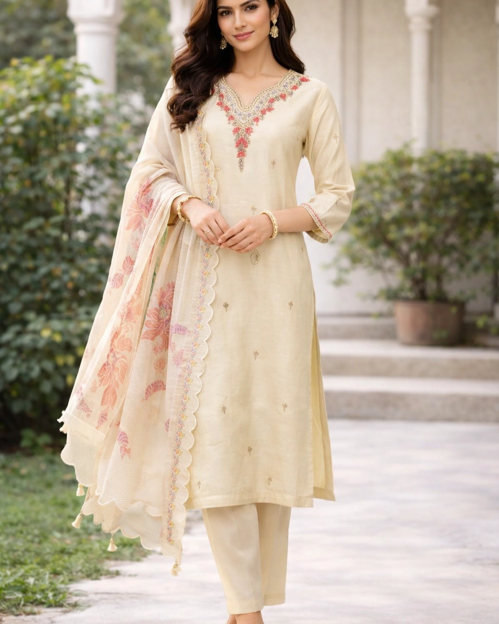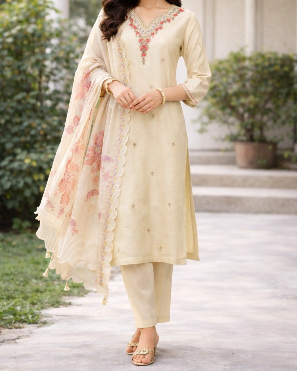 Product Name: Elegant Beige Embroidered Kurta Set with Floral Dupatta