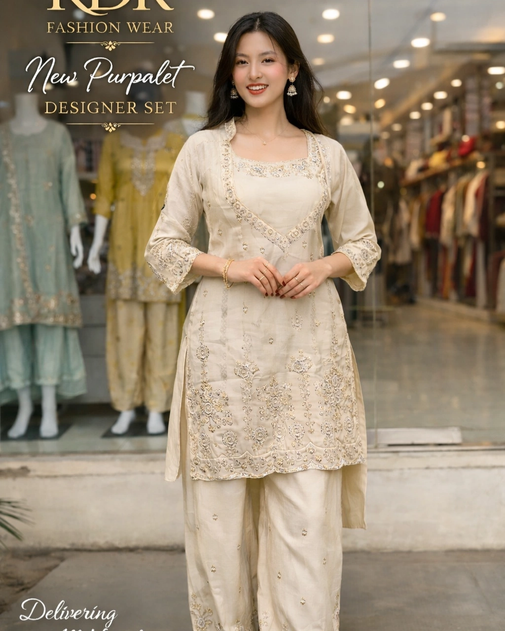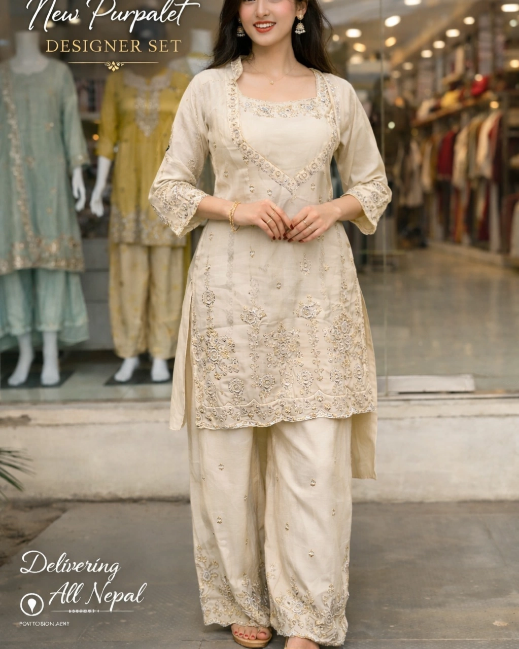 Product Name: Elegant Cream Embroidered Designer Kurtha Set