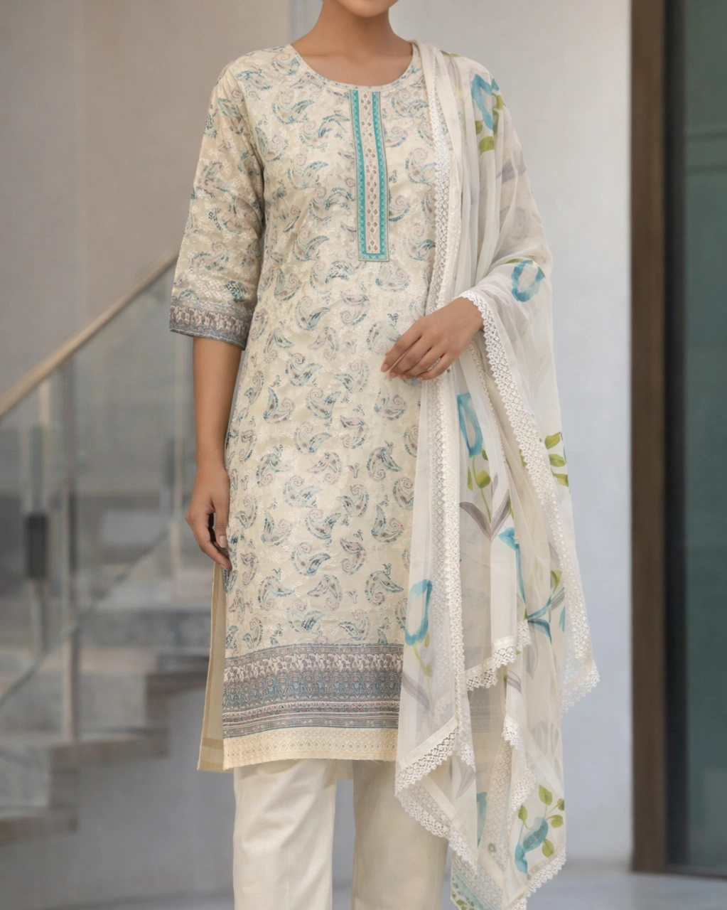 Work: Beautiful paisley-inspired printed design across the kurta with a stylish embroidered neckline panel. The sleeves and hemline feature delicate border detailing that enhances the overall elegance. The lightweight organza dupatta is decorated with soft floral prints and lace edging for a graceful finish.