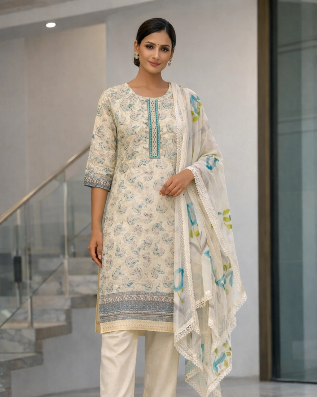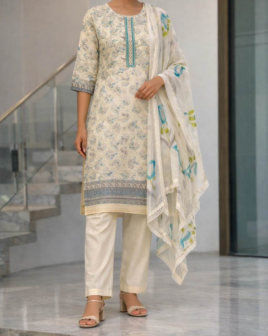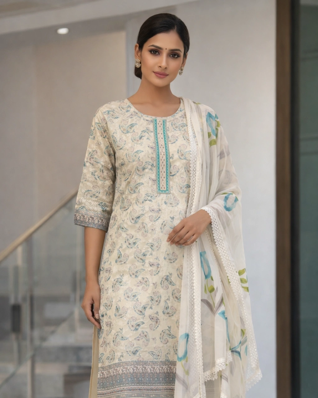 Style: Elegant ethnic outfit suitable for festive wear, casual gatherings, office wear, and daytime occasions. The subtle cream tone combined with delicate paisley prints creates a classy and timeless traditional look.