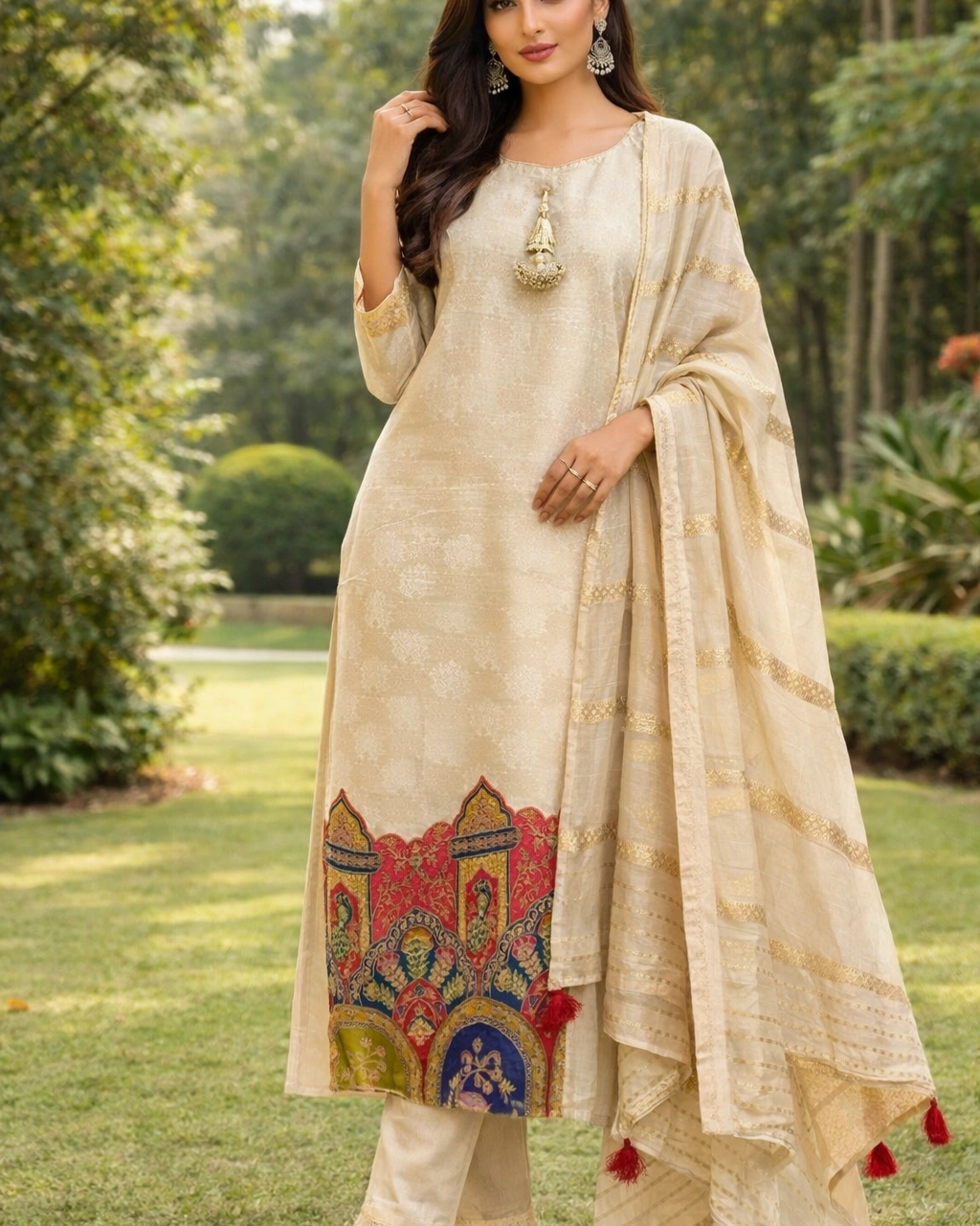 Work: Beautiful subtle self-textured fabric with a vibrant traditional printed border at the hemline featuring intricate architectural and floral motifs. The neckline is enhanced with elegant tassel detailing, while the dupatta features delicate golden stripe patterns and tassel accents, giving the outfit a rich traditional look.