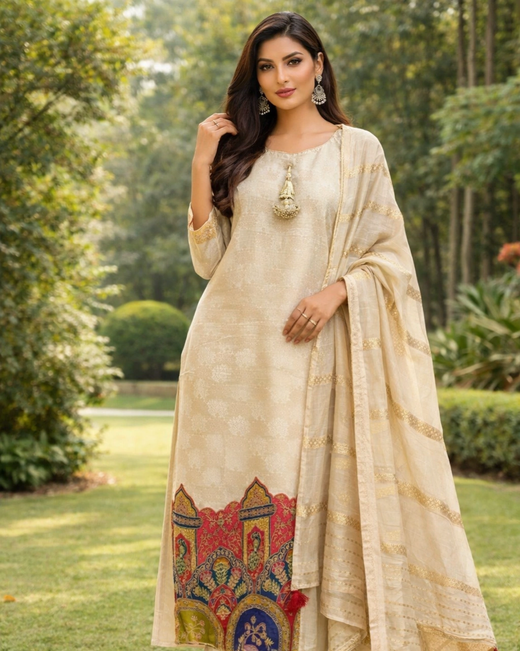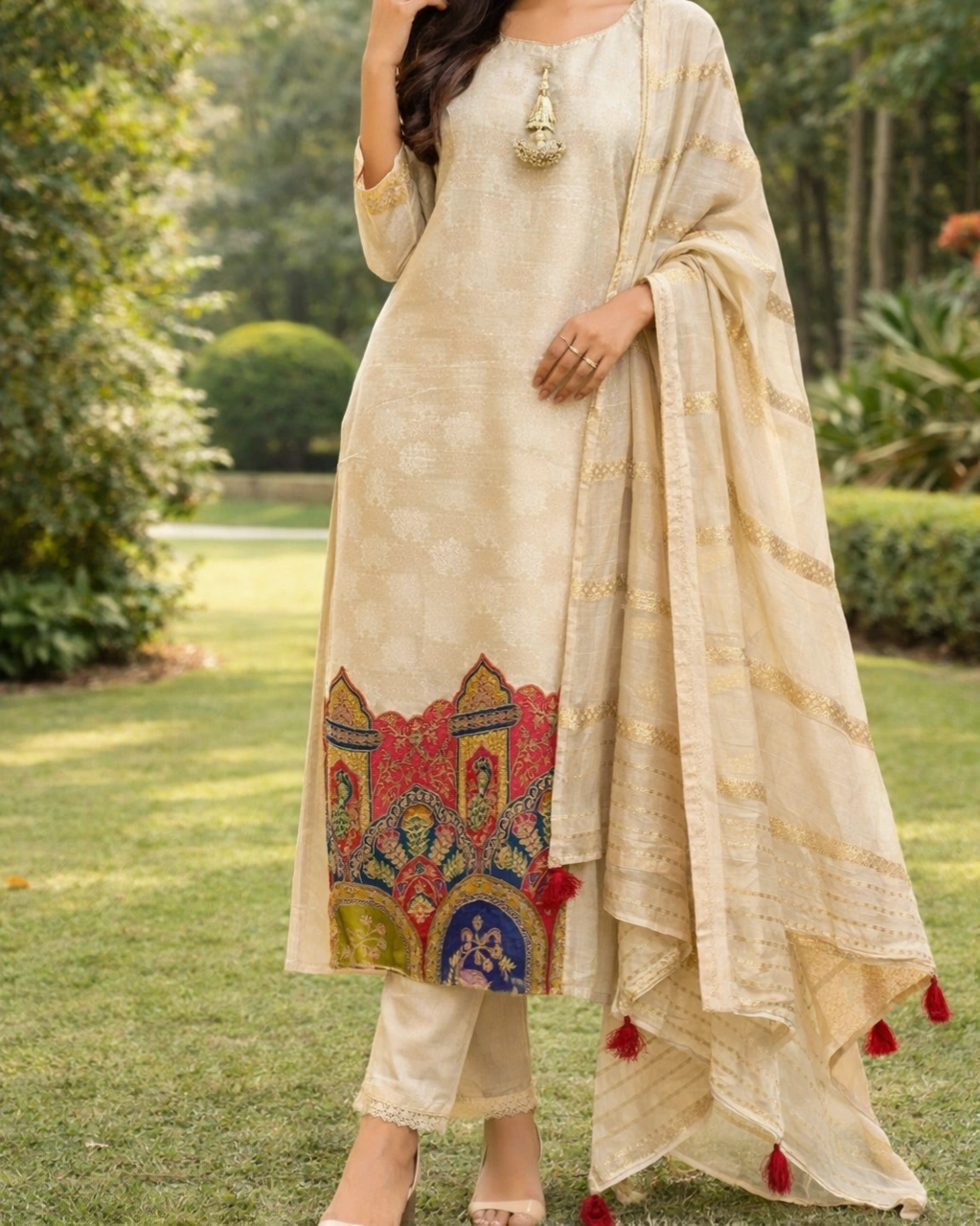Product Name: Elegant Cream Printed Kurta Set with Designer Dupatta