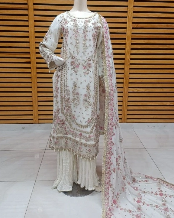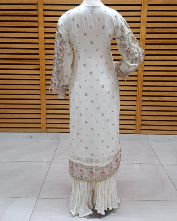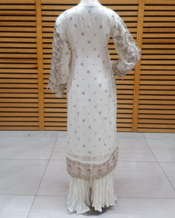 Step into timeless sophistication with this stunning ivory sharara set, beautifully adorned with delicate pink and golden embroidery. The straight-cut kurti features intricate floral thread work and zari detailing throughout the front, neckline, sleeves, and hemline, giving it a soft yet luxurious bridal-inspired look.