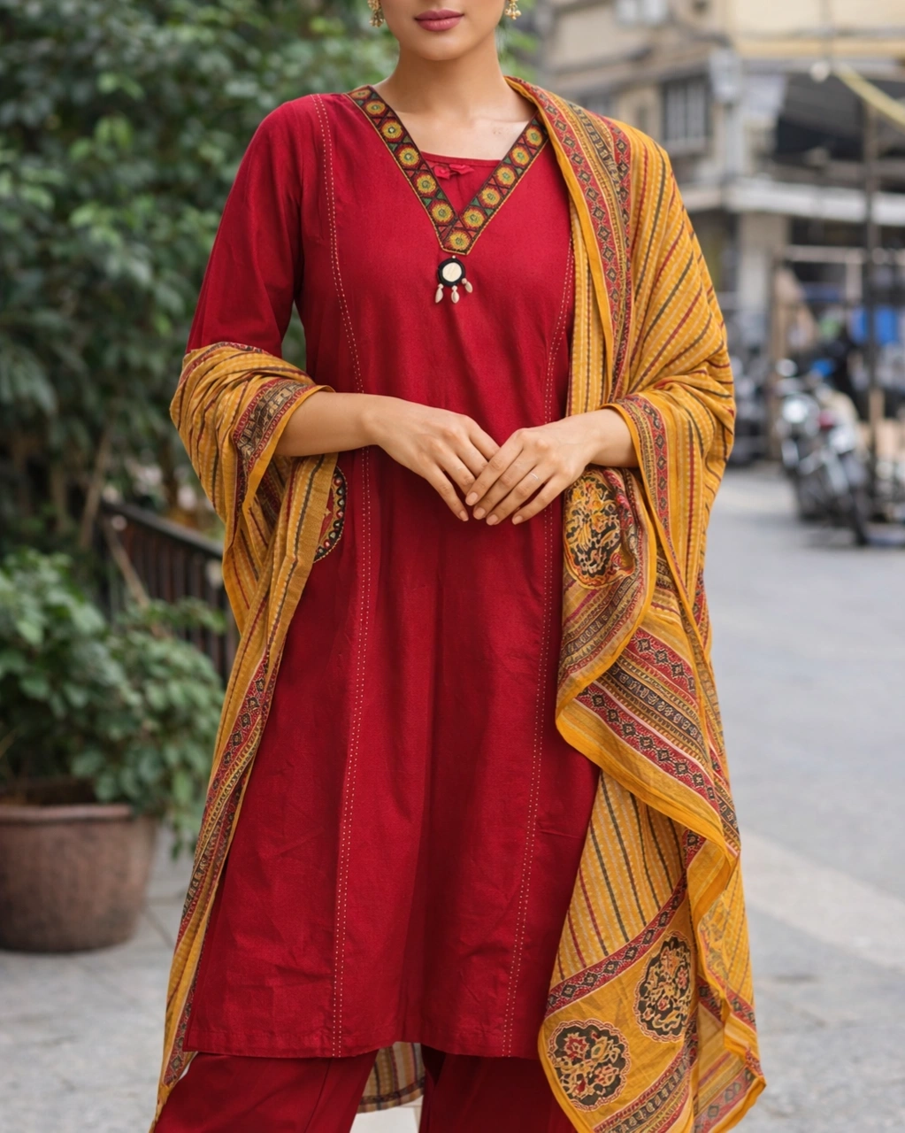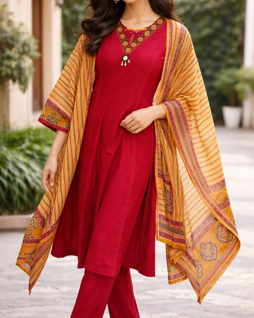Style: Traditional ethnic outfit perfect for festive occasions, casual gatherings, cultural events, and everyday elegant wear. The deep maroon tone combined with the vibrant printed dupatta creates a striking and graceful traditional appearance.