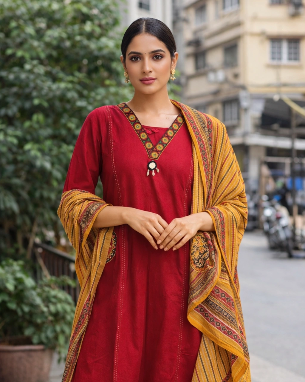 Product Name: Elegant Maroon Ethnic Kurta Set with Printed Dupatta