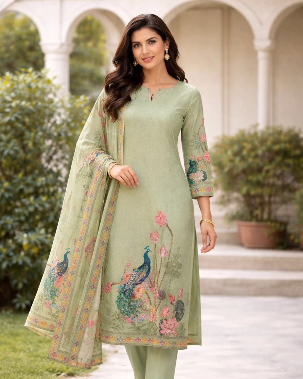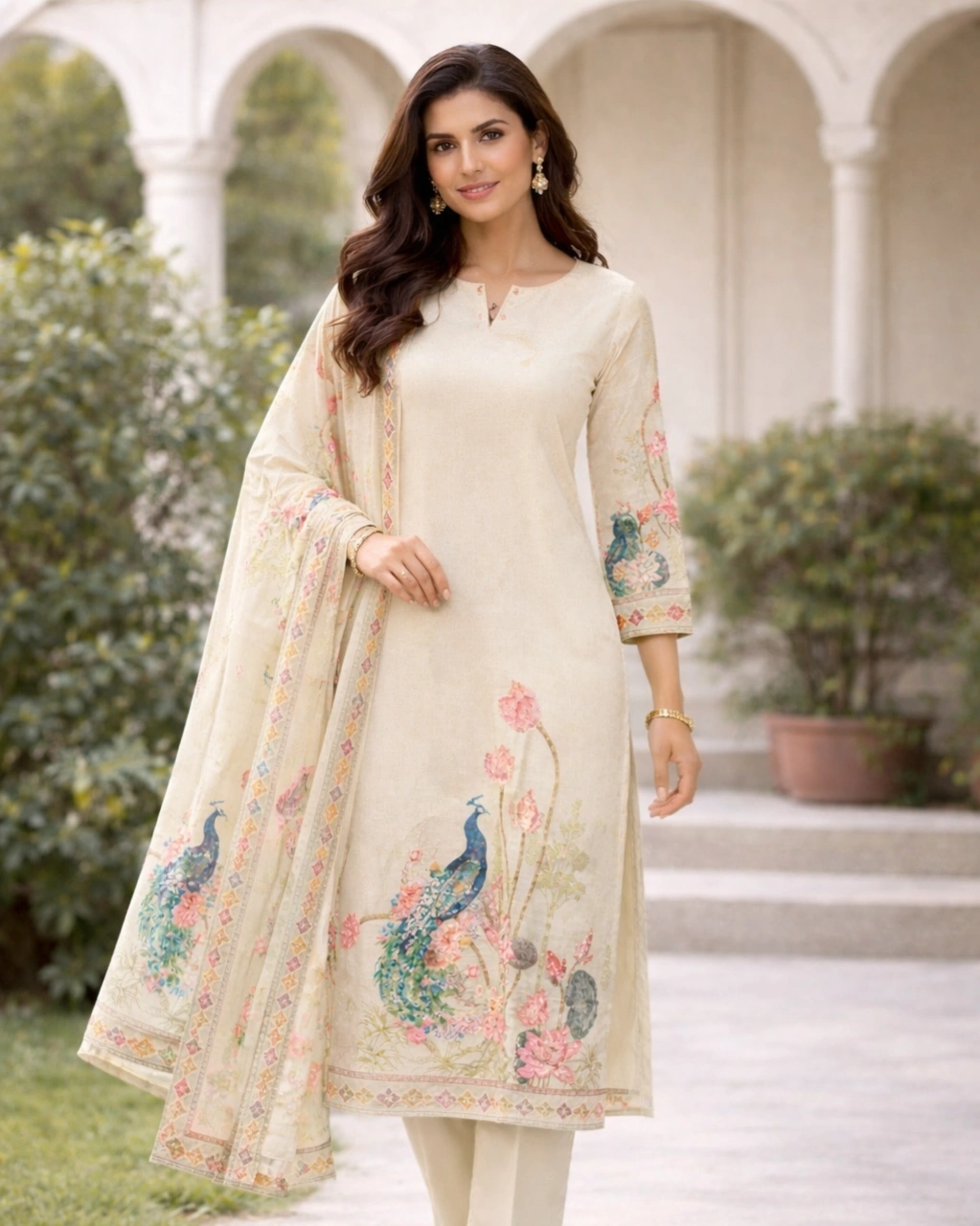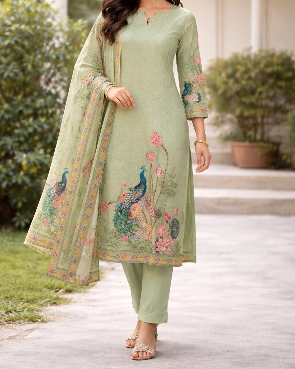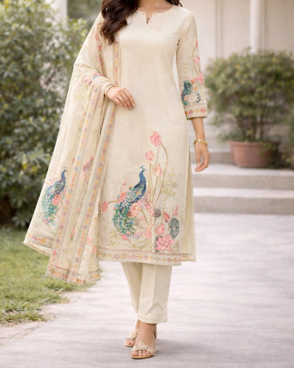 Work: Beautiful artistic peacock and floral digital print on the kurta, creating a graceful and nature-inspired design. The sleeves feature delicate printed detailing, while the matching dupatta showcases elegant floral and peacock patterns with decorative borders that enhance the outfit’s charm.