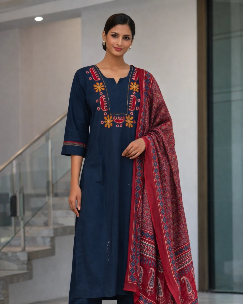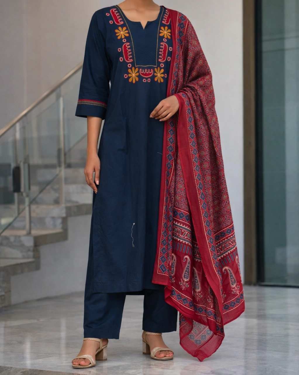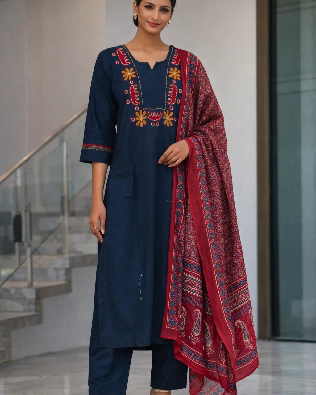 Style: Stylish ethnic wear ideal for festive occasions, casual gatherings, office wear, and traditional events. The deep navy shade paired with the vibrant dupatta creates a bold and elegant traditional look.