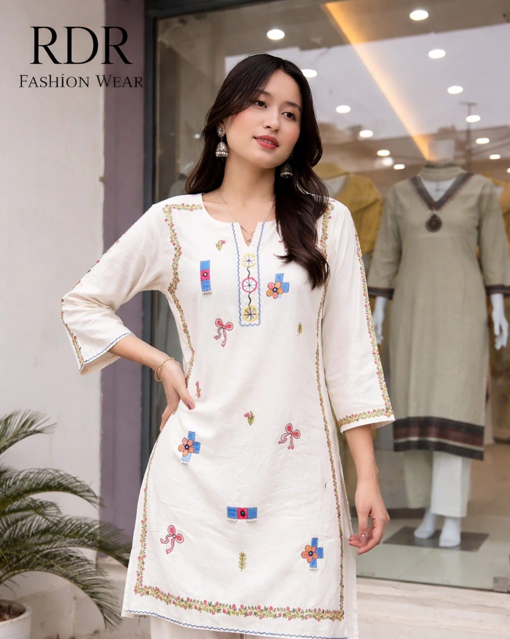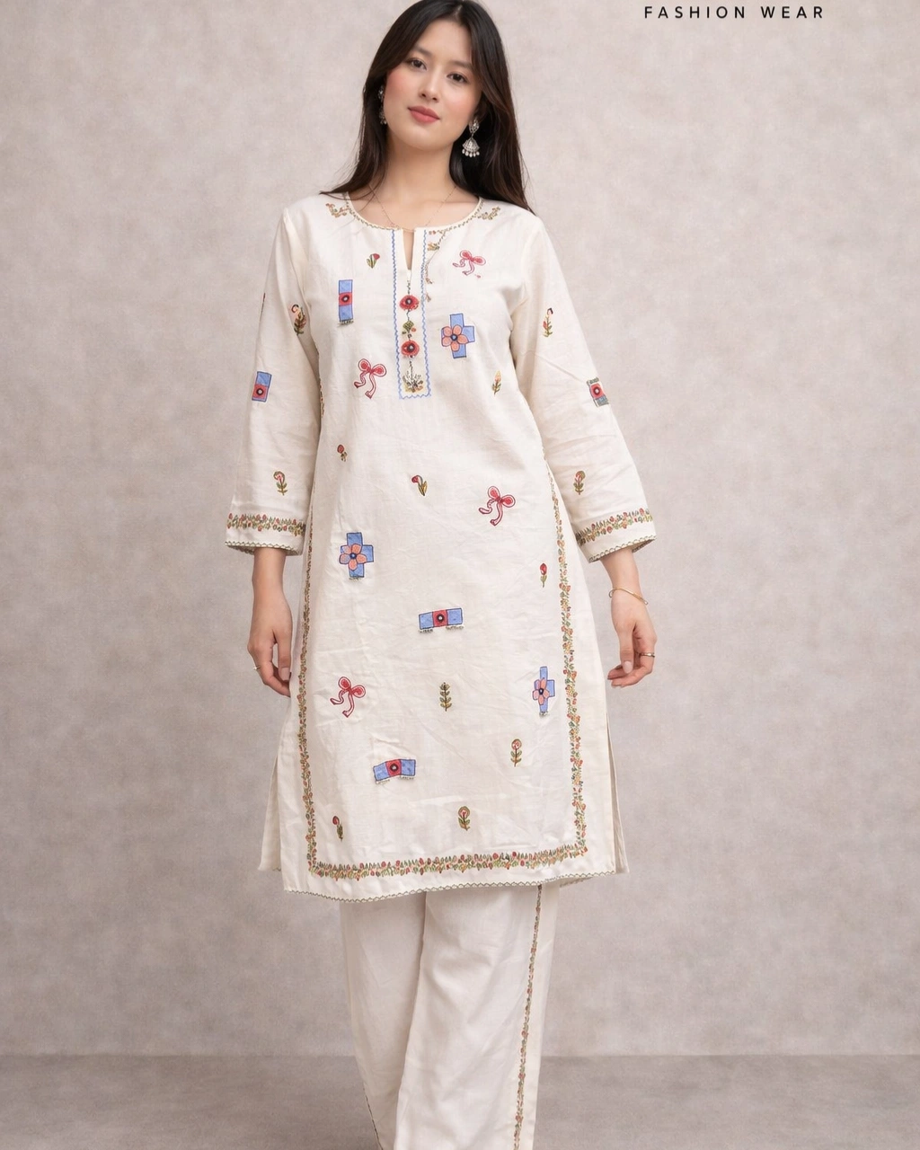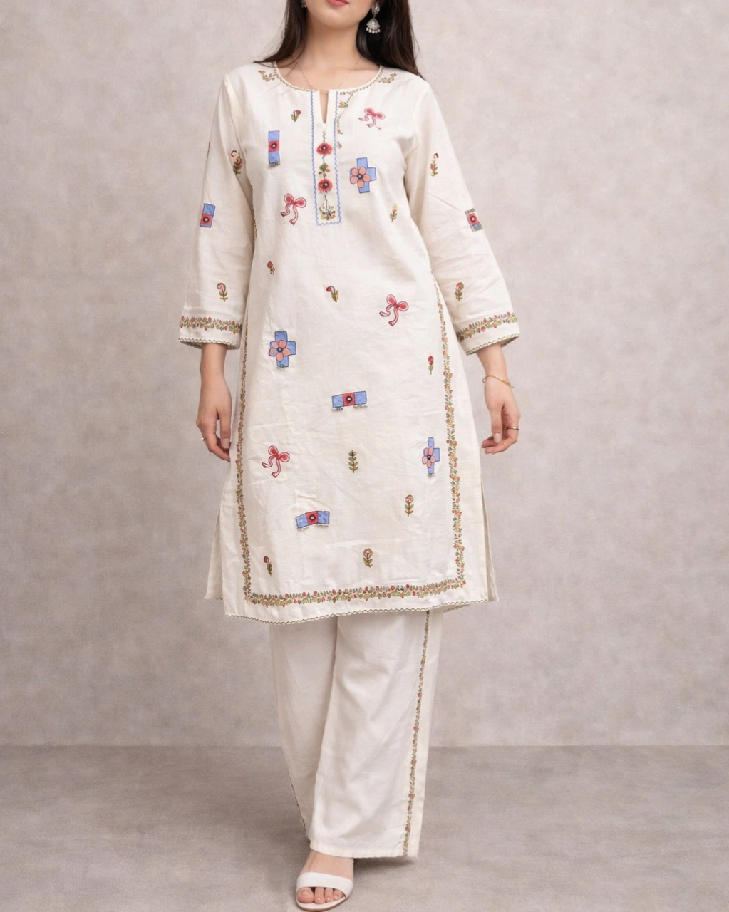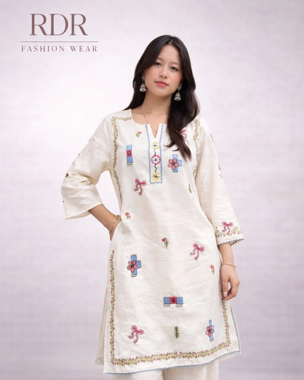 Beautiful multicolor thread embroidery with delicate floral and geometric motifs across the front panel. The kurtha is enhanced with subtle border embroidery on the sides and hemline, giving it a graceful and modern ethnic look.