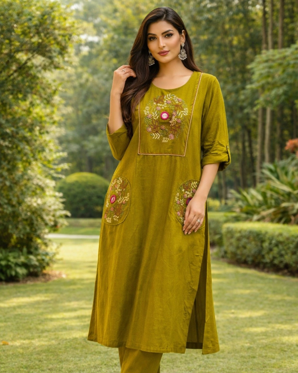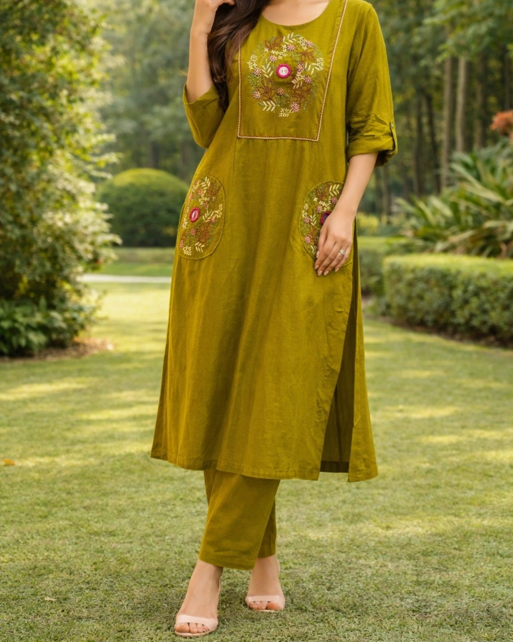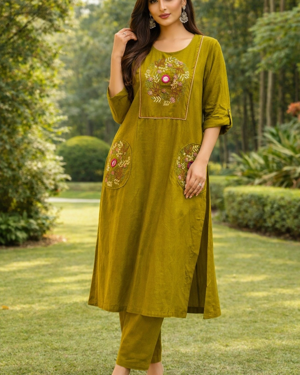 Work: Beautiful floral embroidery on the front panel with delicate thread detailing. The kurta also features stylish embroidered pocket patches that add a modern and unique design element, making the outfit both elegant and practical.