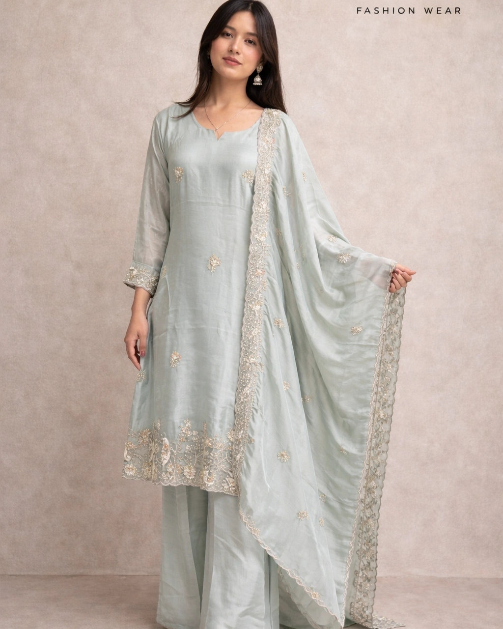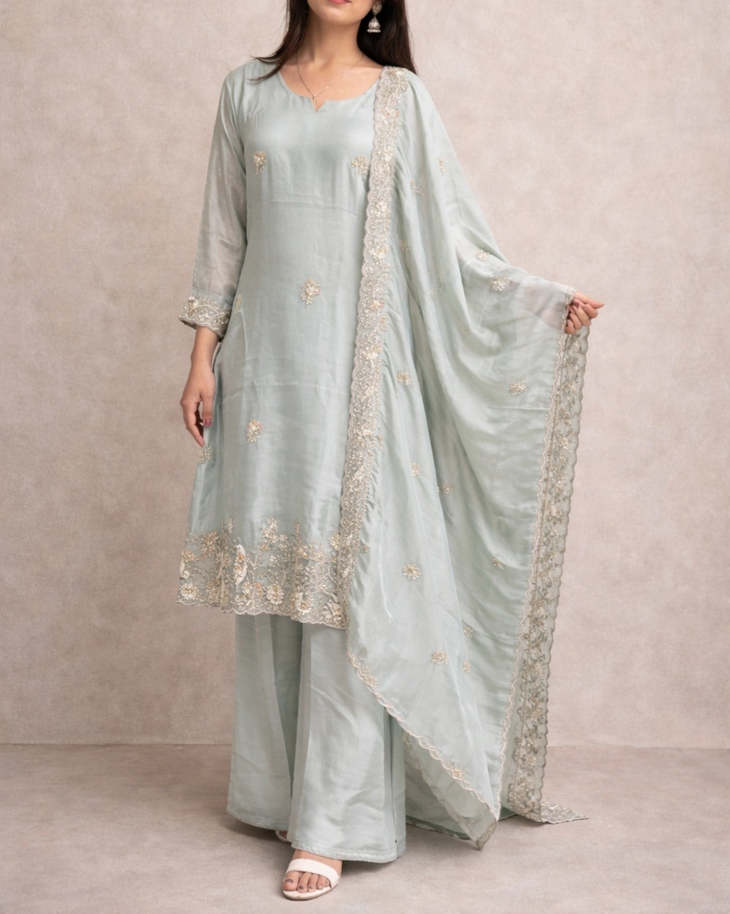 Product Name: Elegant Pastel Green Embroidered Kurta Palazzo Set with Dupatta