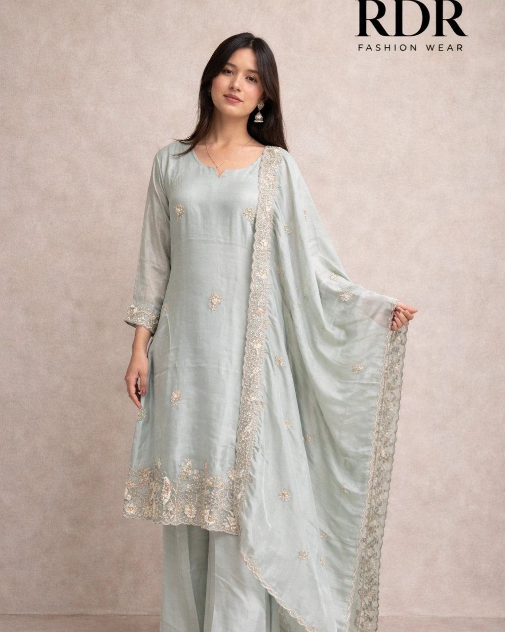 Work: Delicate floral embroidery with fine thread and sequin detailing on the kurta and dupatta borders, giving a graceful and luxurious finish.
