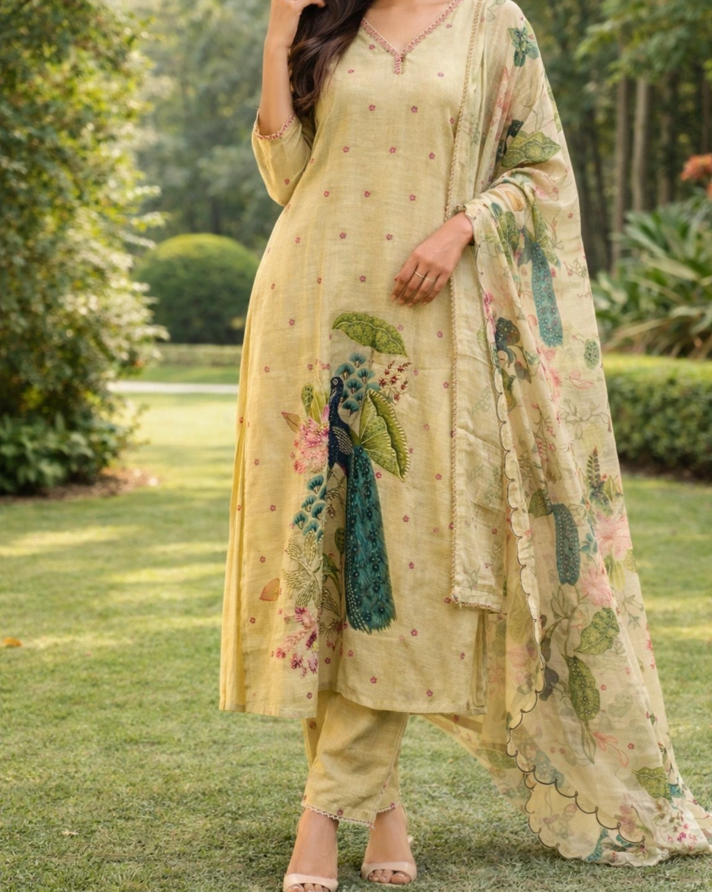 Work: Beautiful peacock-inspired artistic print on the kurta complemented by delicate floral motifs across the fabric. The neckline features subtle decorative stitching, while the lightweight dupatta showcases an elegant nature-inspired print with soft scalloped borders, giving the outfit a graceful and refreshing look.