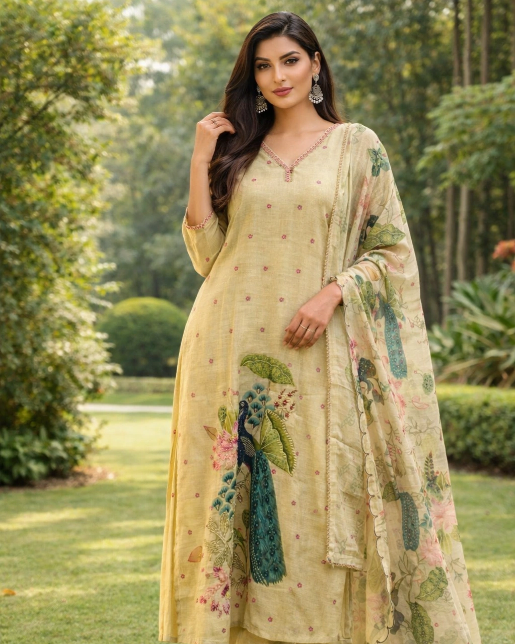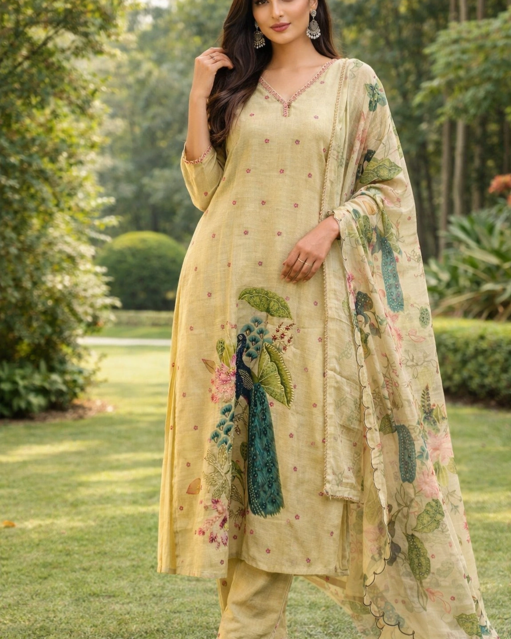 Product Name: Elegant Pastel Yellow Peacock Printed Kurta Set with Dupatta