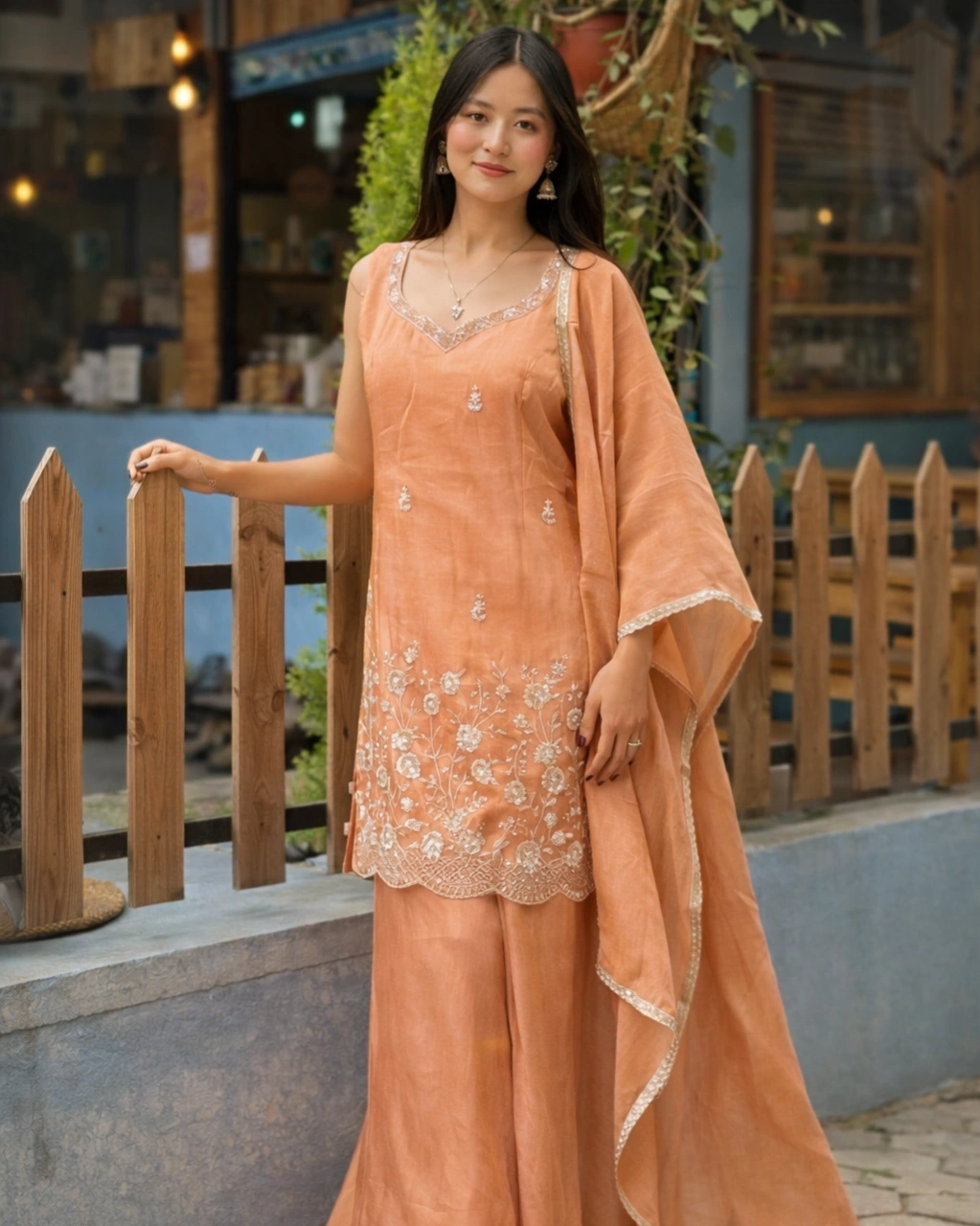 Product Name: Elegant Peach Embroidered Kurta Palazzo Set