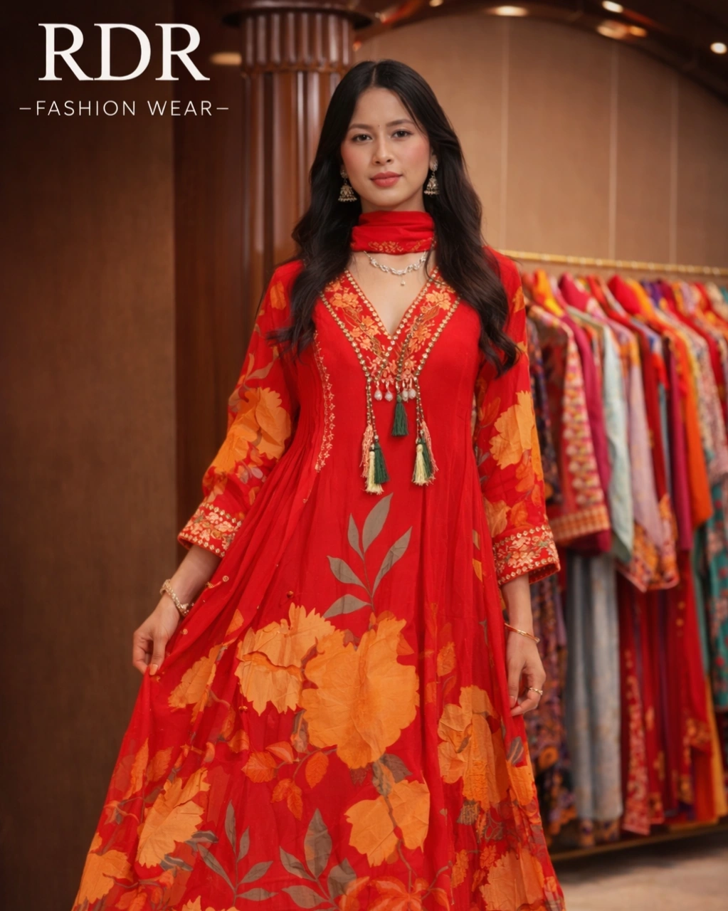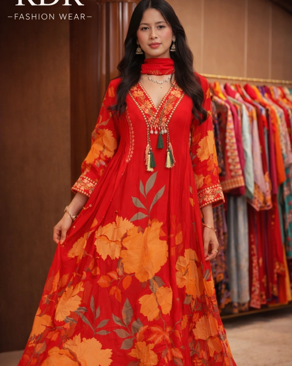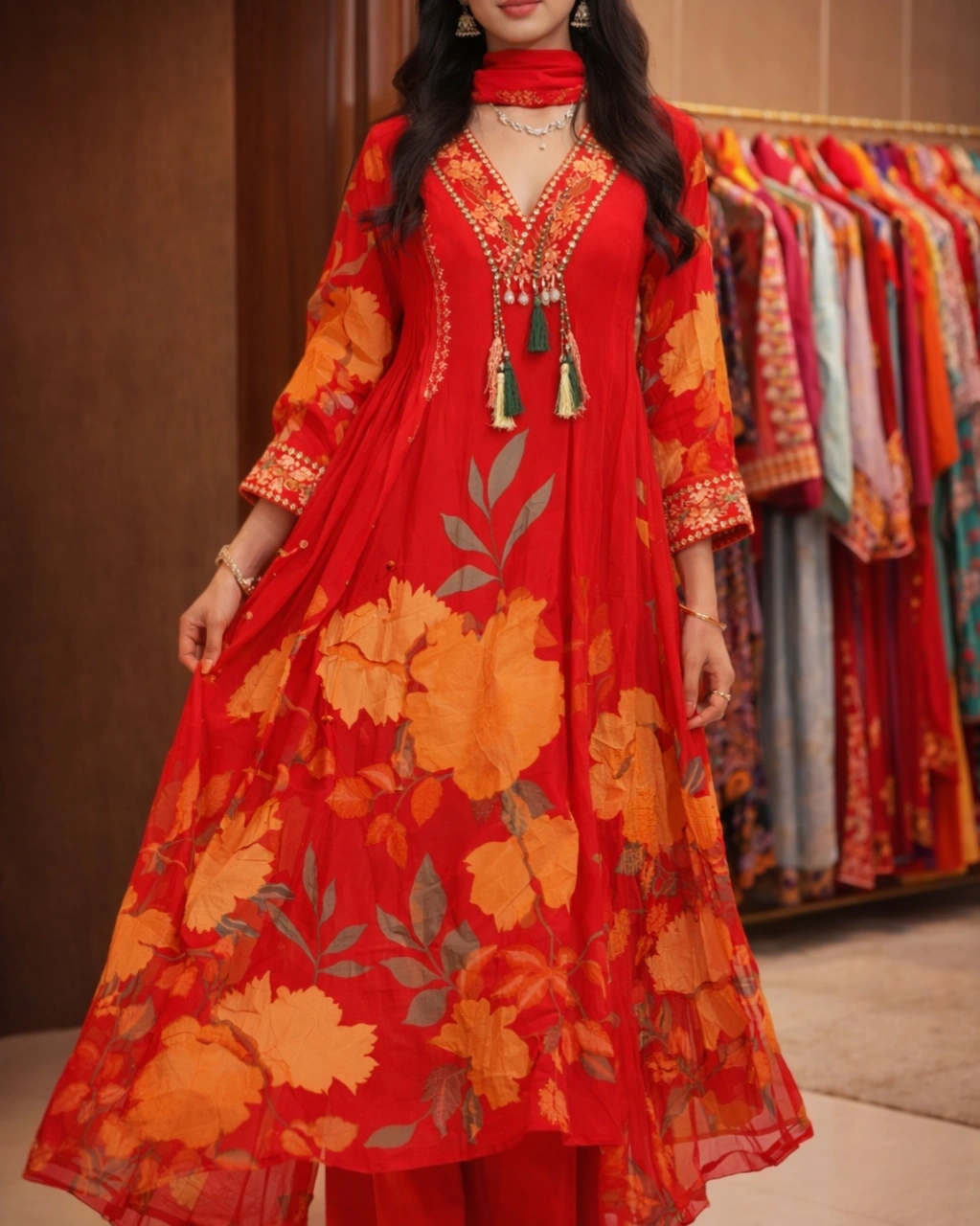Beautiful floral digital print with delicate embroidery work on the neckline, highlighted with stylish tassel detailing that adds a graceful and festive look.