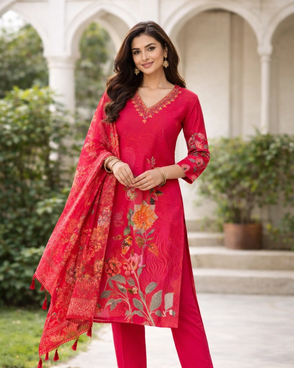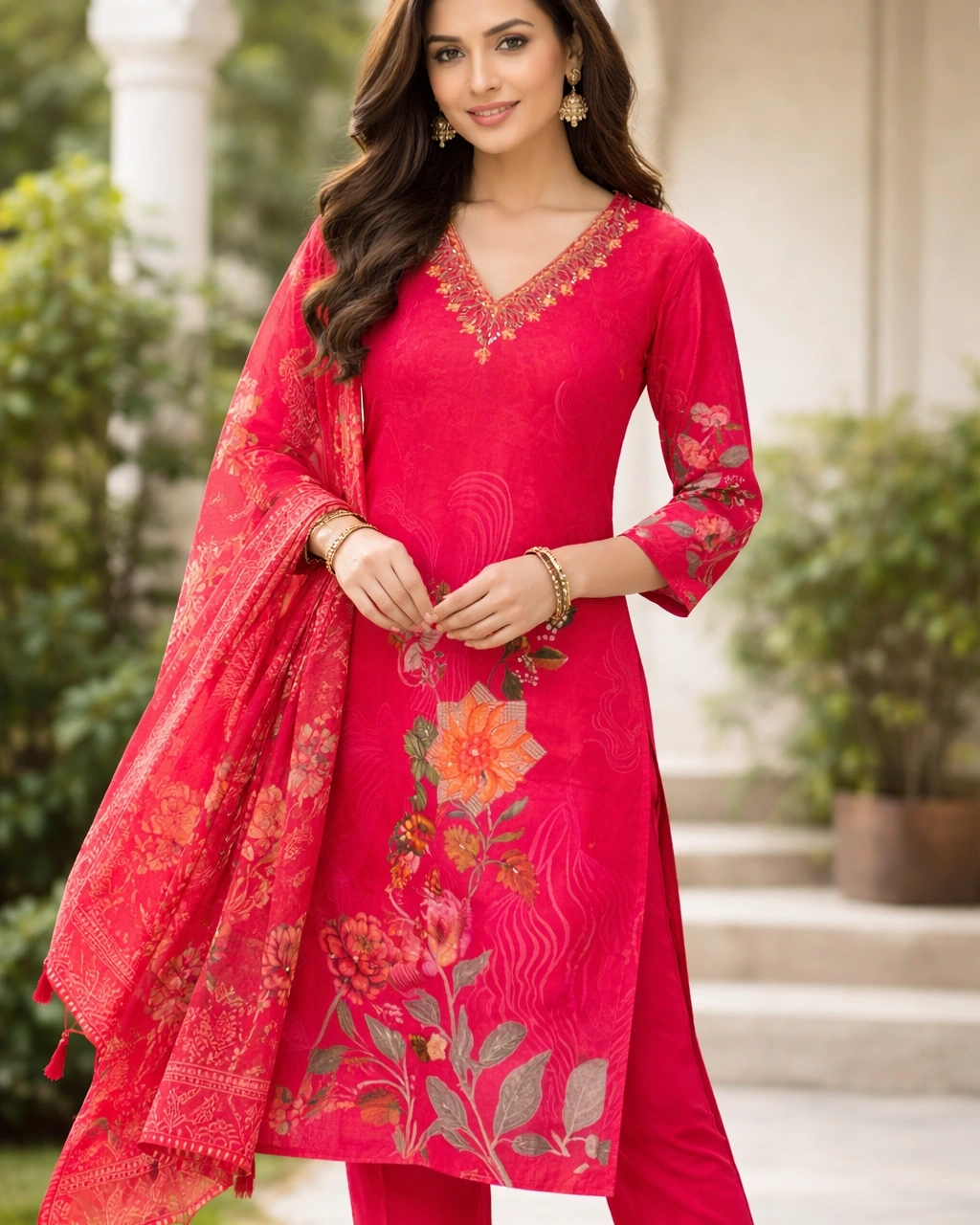 Product Name: Elegant Red Floral Printed Kurta Set with Dupatta