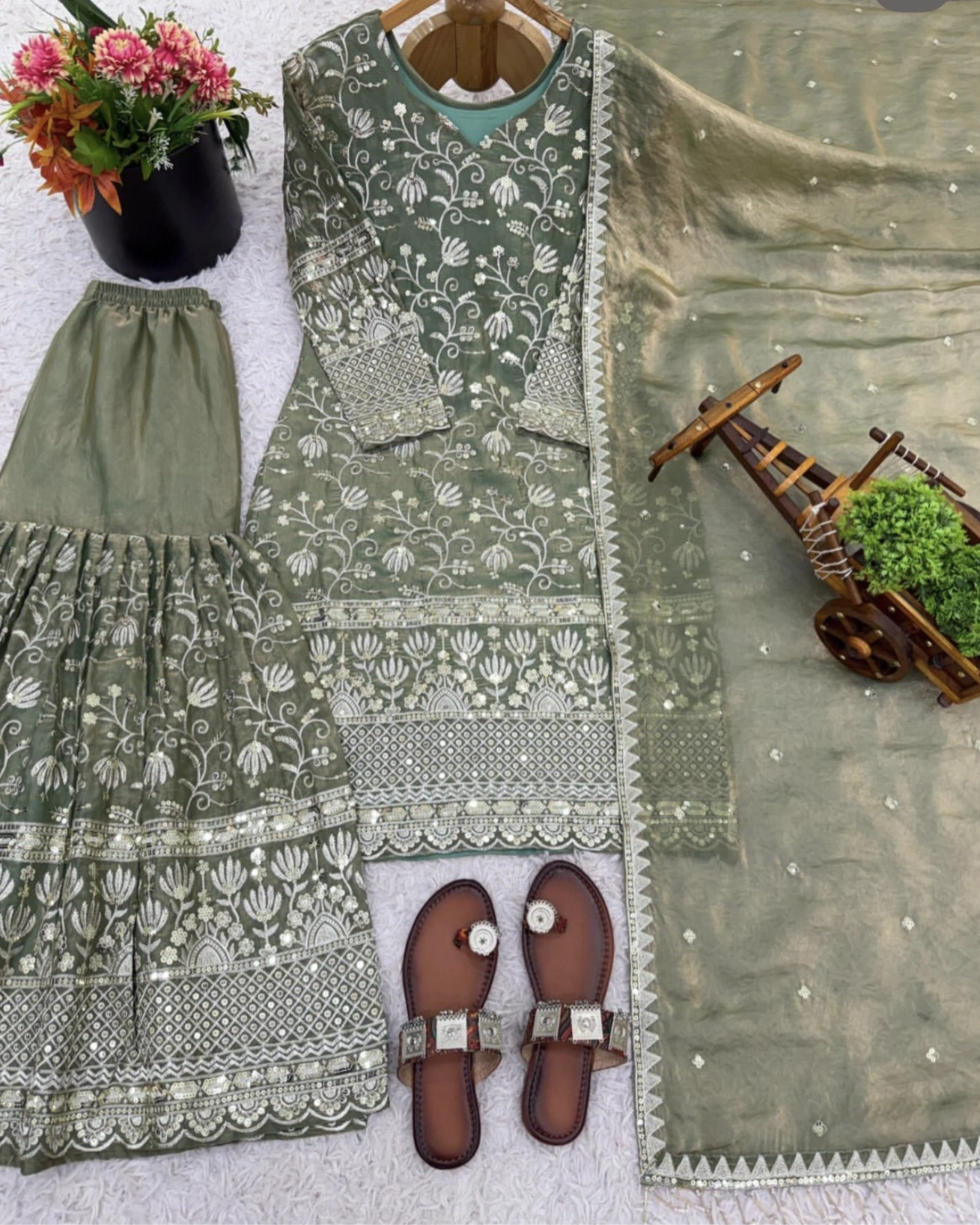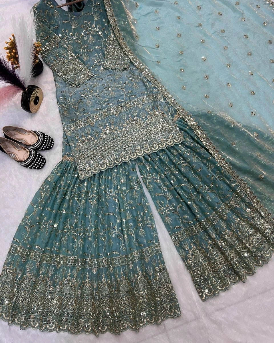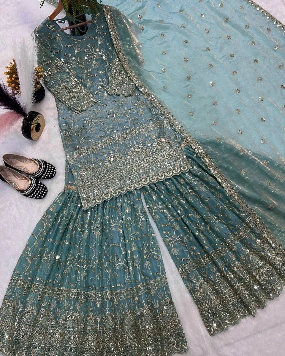 Elegant Sage Green Embroidered Sharara Set (3-Piece)