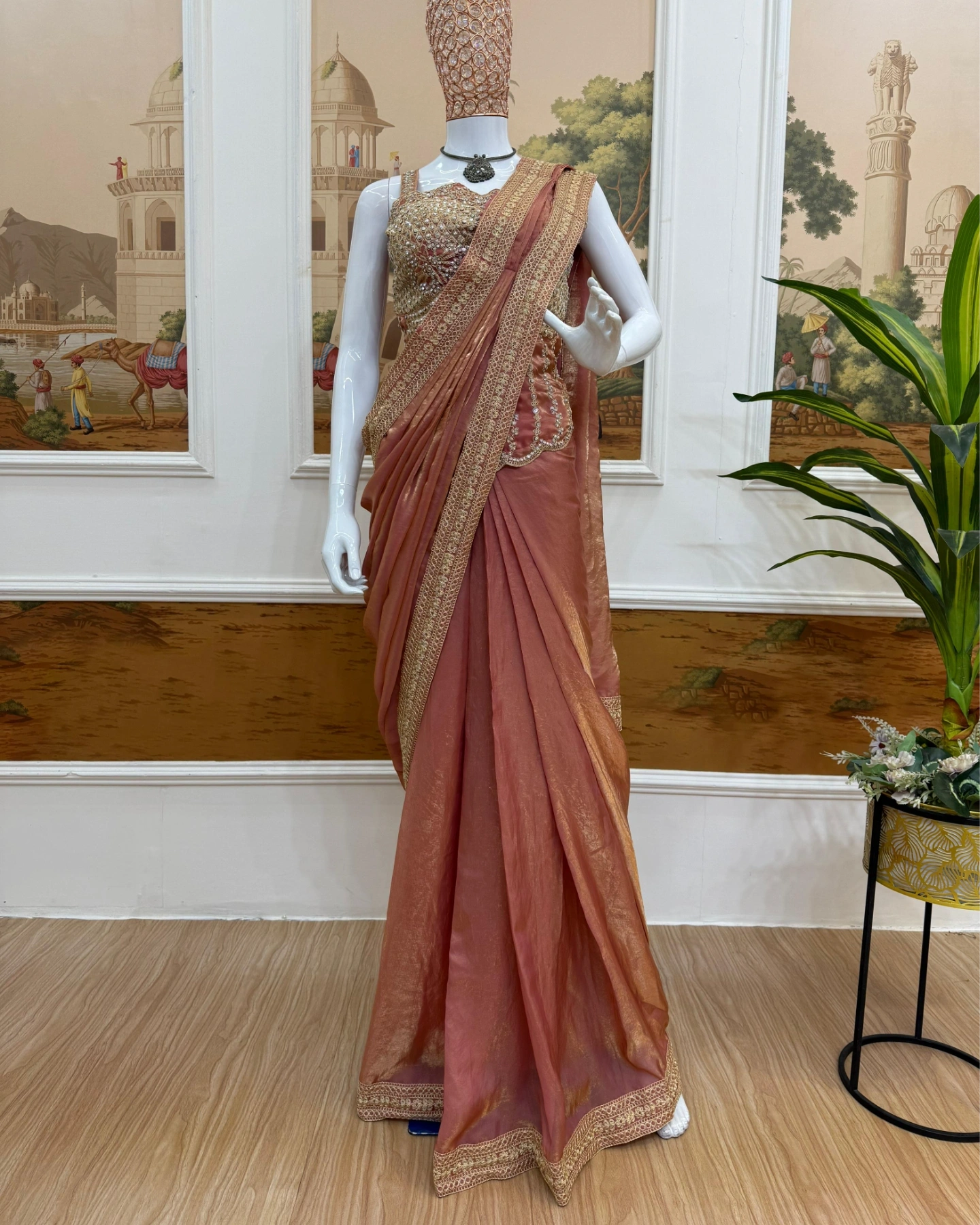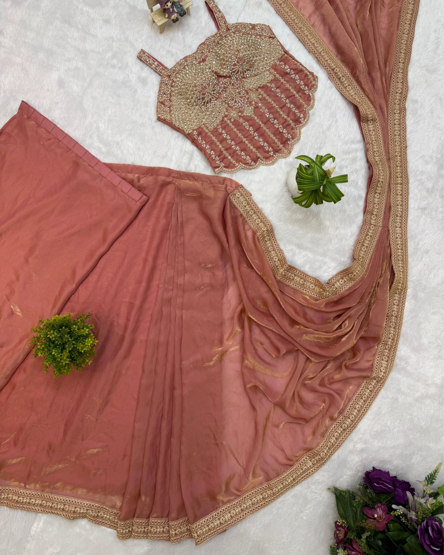 Upgrade your festive wardrobe with this stunning Indo-Western saree set in a beautiful dusty rose shade. The designer blouse features intricate heavy golden embroidery with stone and bead work, creating a luxurious and glamorous look. The scalloped hemline and detailed craftsmanship make it perfect for weddings, receptions, parties, and special occasions.
