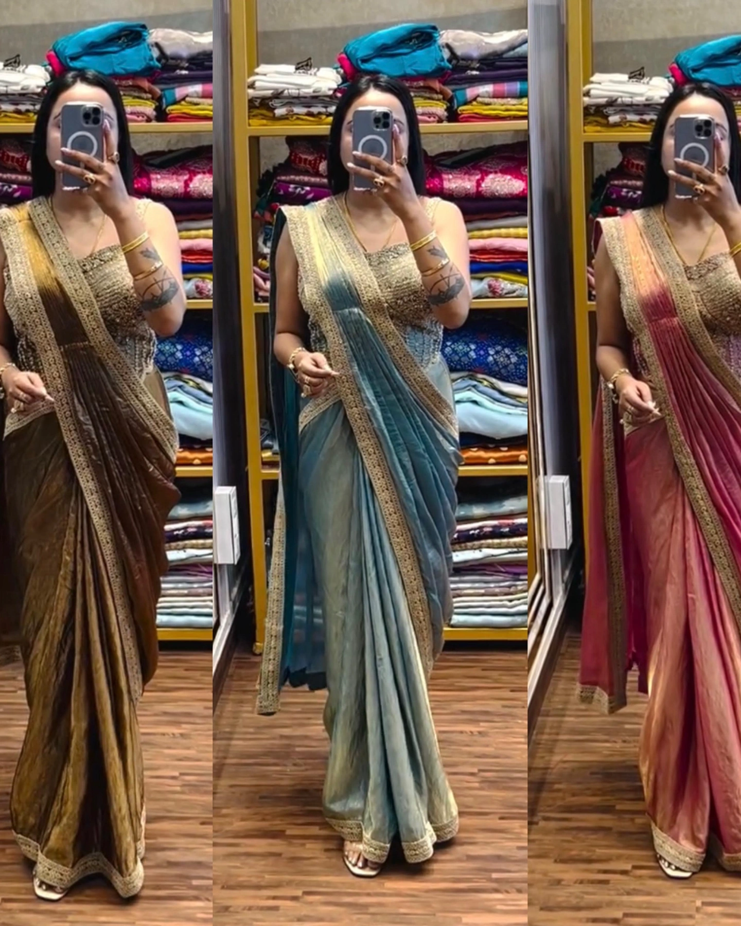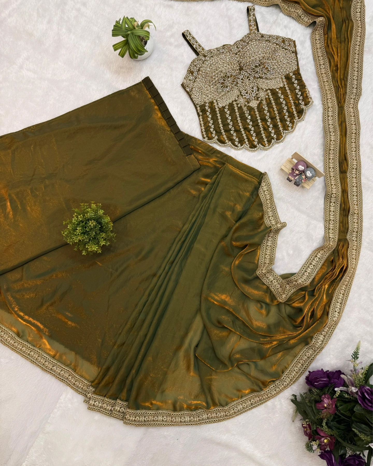 The saree comes with a graceful golden lace border that adds richness and elegance to the overall outfit. This modern yet traditional fusion piece is designed for women who love to stand out in style.