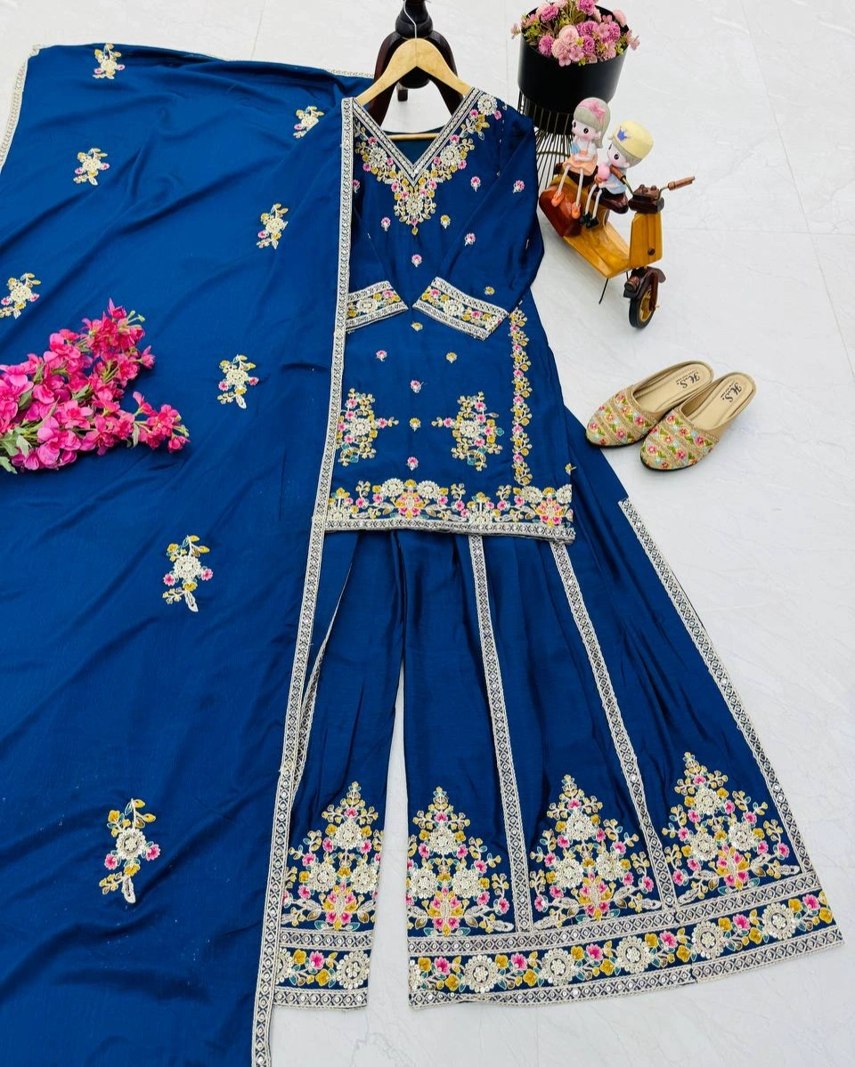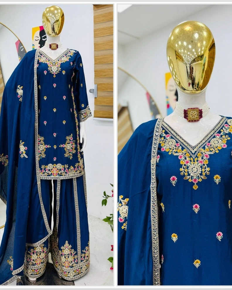 Product Name: Royal Navy Blue Sharara Set with Intricate Zari Work