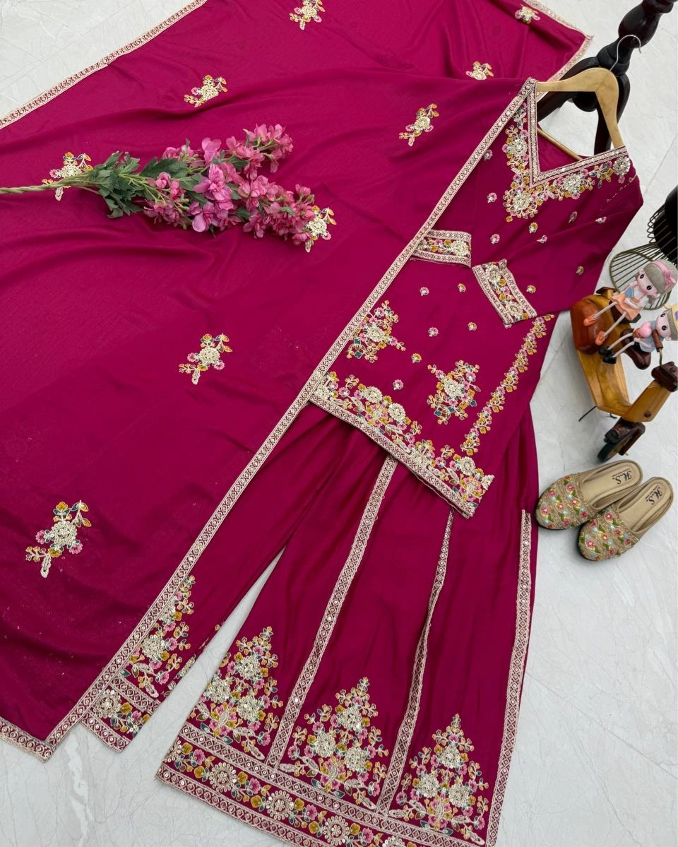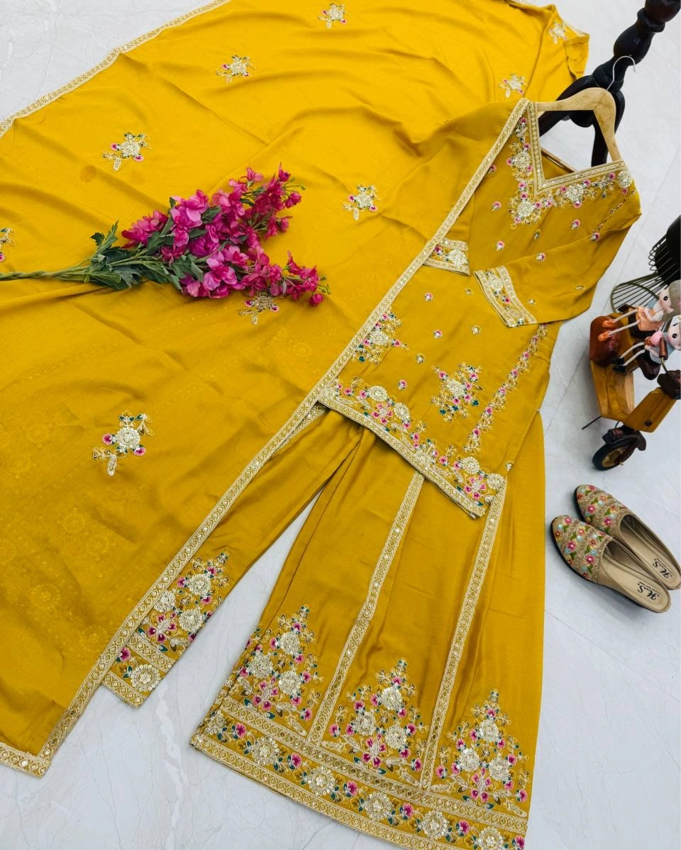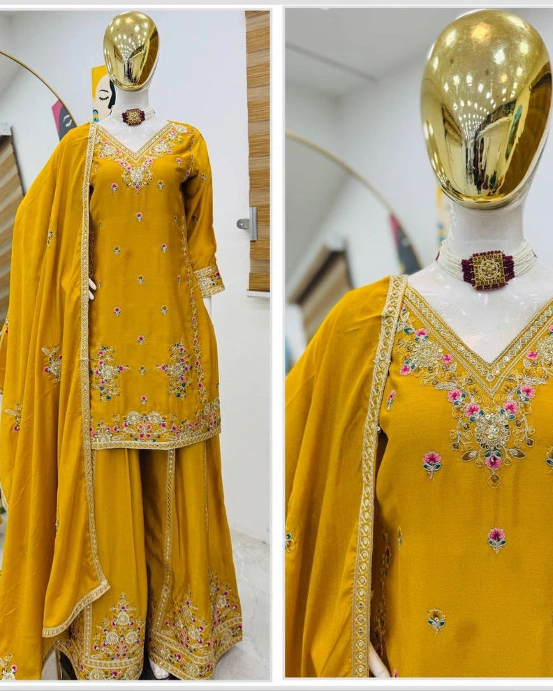 Work: Intricate Golden Zari Embroidery with multi-color floral highlights on the V-neck, mid-body, and bottom borders of both the kurta and sharara. The dupatta features a delicate golden lace border.