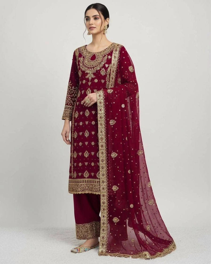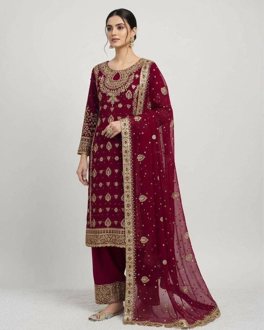 Product Name: Royal Maroon Heavily Embroidered Suit Set with Net Dupatta